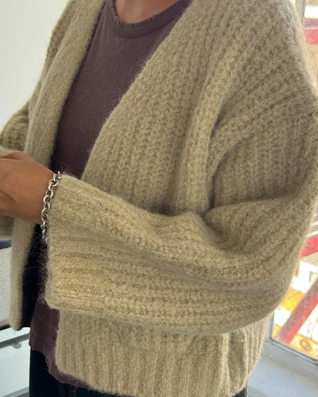 The Alpaca Sweater Jacket delivers the warmth and comfort of a cozy bear hug in a fresh, modern take on the open-front cardigan. For those who loved the Grandpa Alpaca Vest, this sweater is a perfect match. Crafted from a soft alpaca-blend yarn, it features a relaxed fit with a flattering cropped length. Ideal for layering over tees or under heavier coats, it’s the ultimate versatile piece for staying cozy during cooler months.