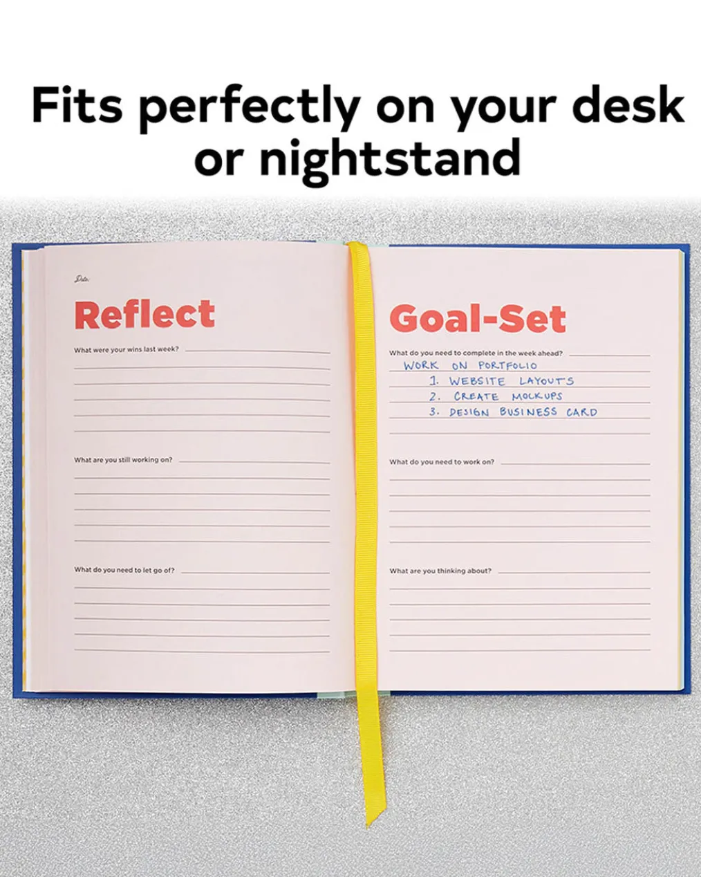 - Each spread includes easy-to-follow prompts for reflecting on recent progress and goal-setting for the days ahead.