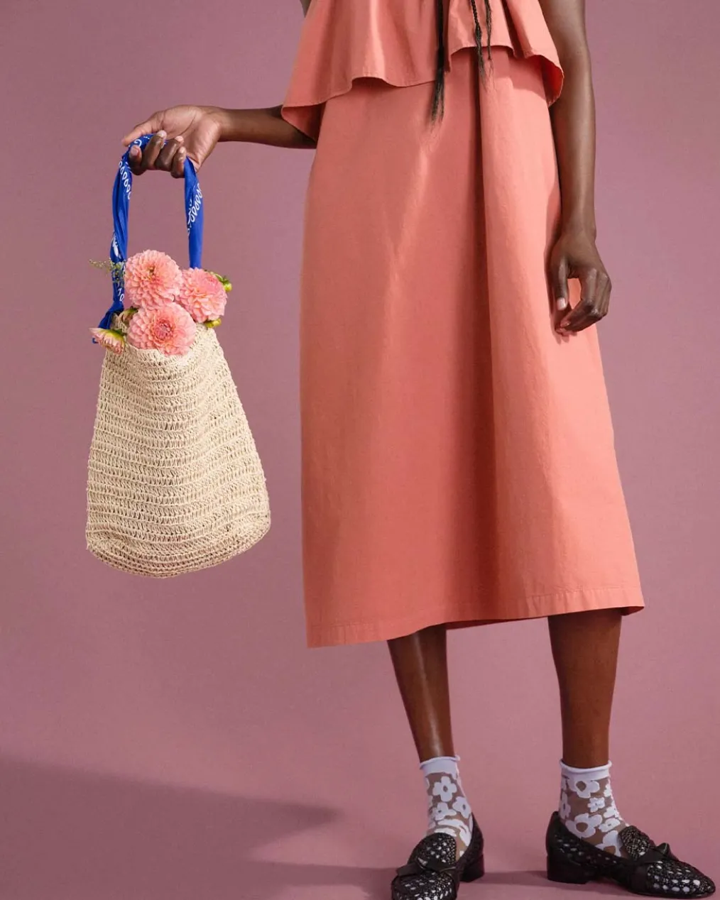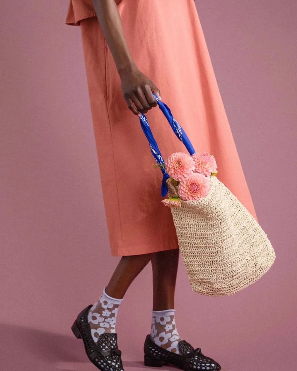 Introducing Hansel From Basel’s new raffia bags! Because they’re a warm weather staple, of course! This one has a bandana-print cotton handle so it’s extra easy on your wrists and shoulders. Perfect for a picnic in the park or a nap at the beach!