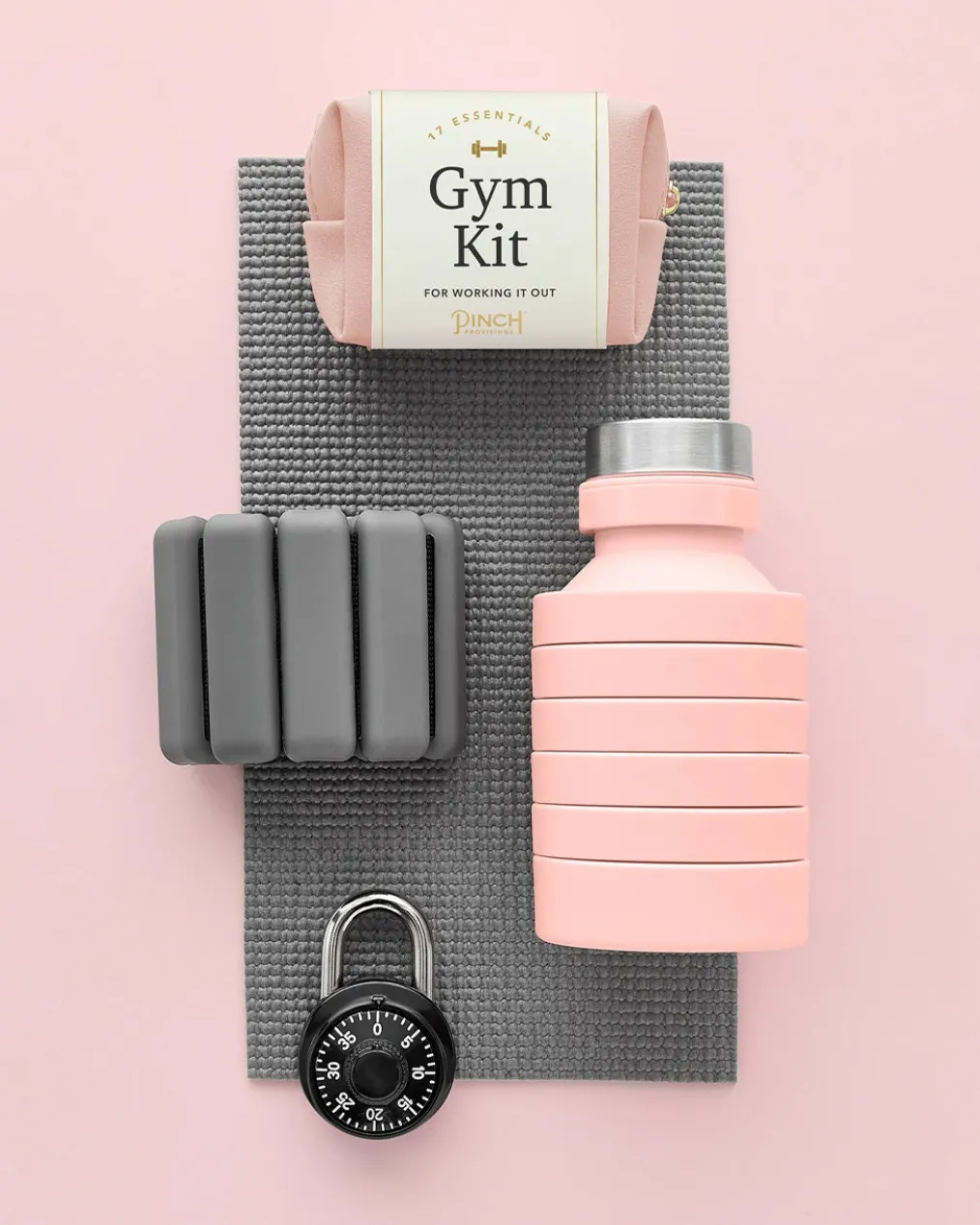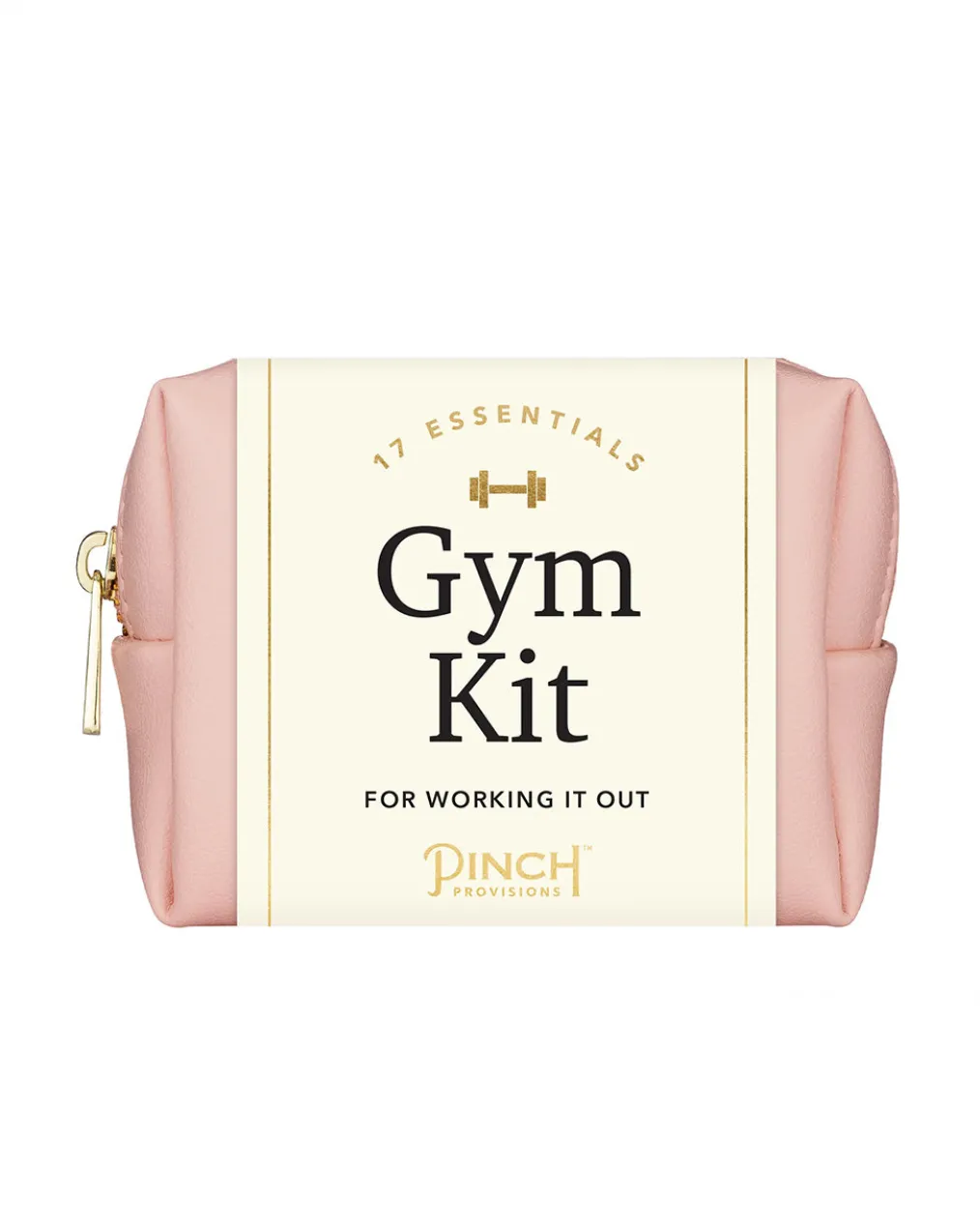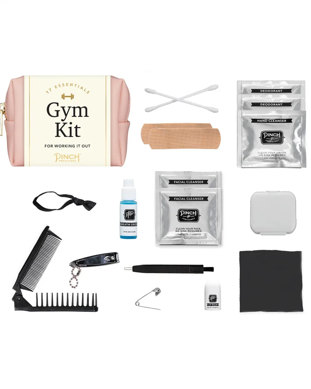 The Gym Kit contains 17 essentials for working it out: adhesive bandages (2), deodorant towelettes (2), nail clipper, facial cleaning towelettes (2), cooling wristband, lip balm, blister balm, earbud cleaning tool, pill container, safety pin, hair tie, folding brush/comb, breath drops, and a hand cleaning towelette.