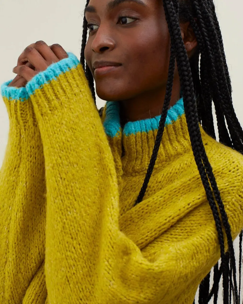 Chunky knitted jacket with front pockets. Straight, wide and long cut. Chimney collar. Wooden buttons. Multi front buttoned pockets. Contrast color details.