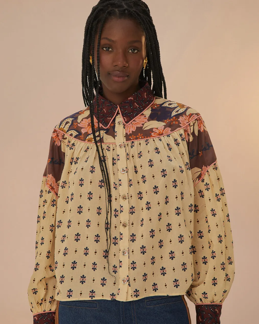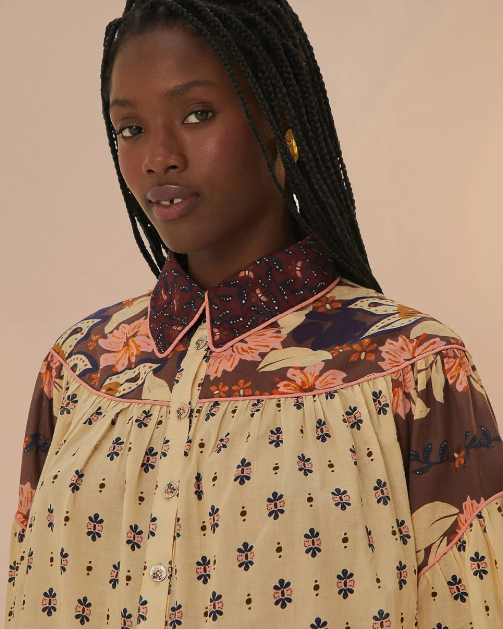 Embrace the bohemian charm of the Ainika Chill Burgundy Blouse from FARM Rio. This stunning piece features a mesmerizing collar neckline that delicately frames the face, while the rich burgundy hue is adorned with intricate patterns that dance across the fabric. The relaxed silhouette is enhanced with playful ruffles and eye-catching embroidery, making it a unique addition to your wardrobe. Perfect for a casual day out or a romantic evening, this blouse exudes effortless elegance.
