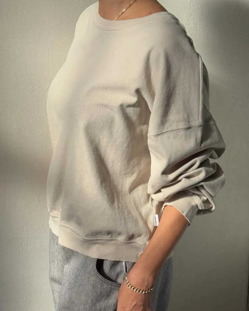 The Cali Jersey Sweatshirt blends the best of The Little Boy Tee and the Poche Top for a playful take on the classic crewneck. Crafted from 100% premium cotton jersey, it offers the lightweight feel of the Little Boy Tee, making it ideal for layering under jackets. It also borrows signature details from the Poche Top, like a ribbed crew neckline and relaxed balloon sleeves. Designed with a slightly oversized fit, it features a perfectly cropped length, creating the perfect balance of style and comfort.
