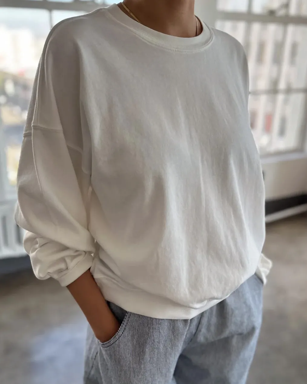 The Cali Jersey Sweatshirt blends the best of The Little Boy Tee and the Poche Top for a playful take on the classic crewneck. Crafted from 100% premium cotton jersey, it offers the lightweight feel of the Little Boy Tee, making it ideal for layering under jackets. It also borrows signature details from the Poche Top, like a ribbed crew neckline and relaxed balloon sleeves. Designed with a slightly oversized fit, it features a perfectly cropped length, creating the perfect balance of style and comfort.