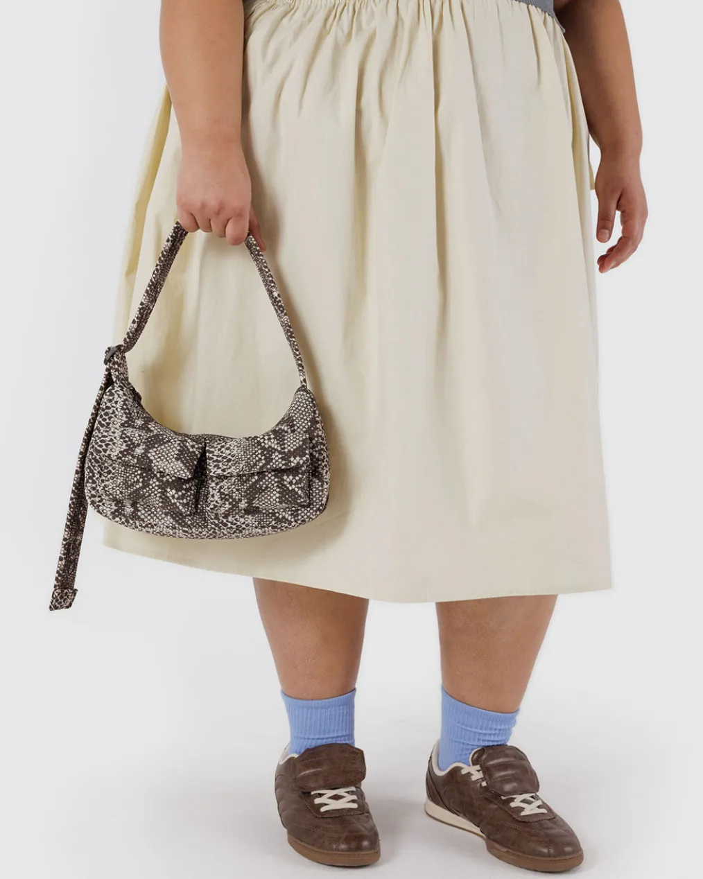 A baguette style purse with two external flap pockets for easy access to your essentials.