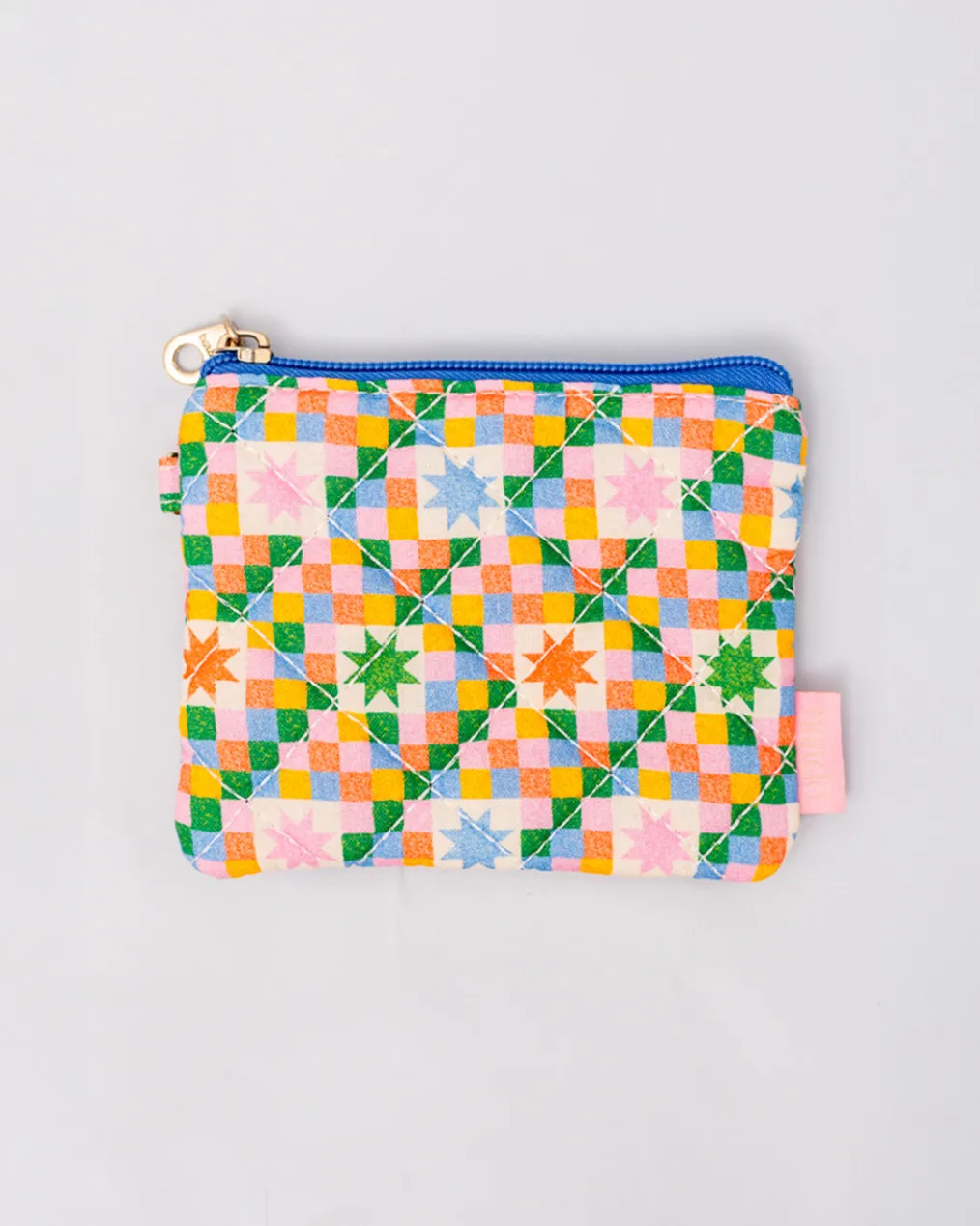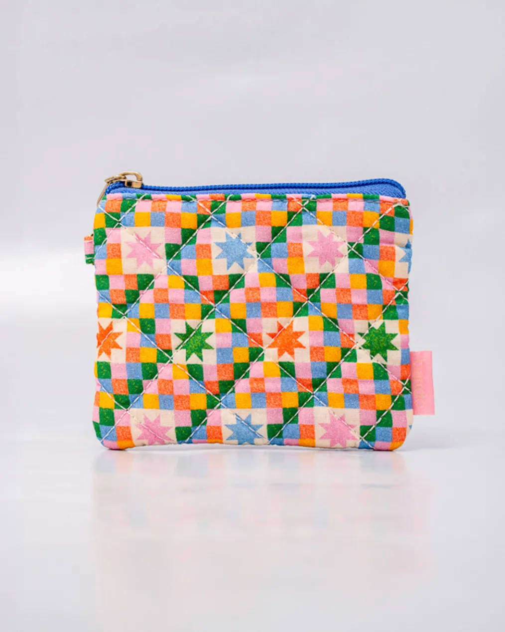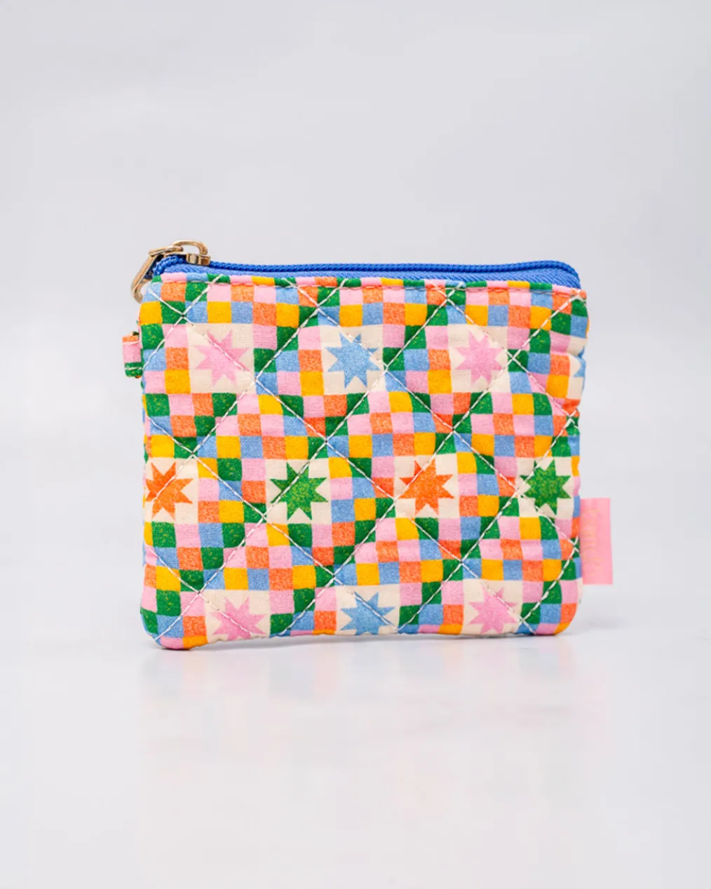 For your laundry quarters and/or arcade tokens. This coin purse is made with a colorful quilted cotton and has a zip closure.