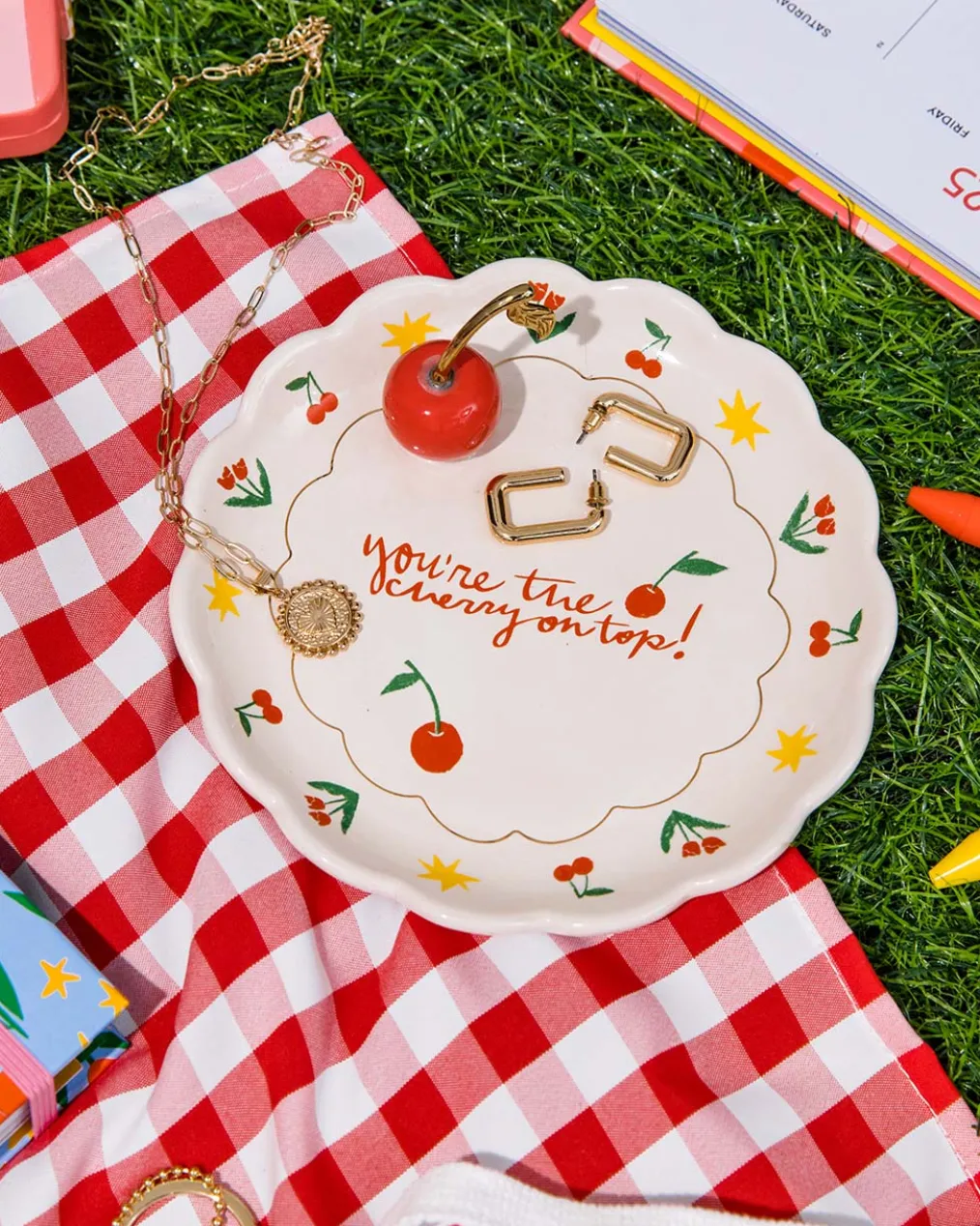 This sweet tray wants to hold your rings, keys, change, after-dinner mints, etc. It’s made of porcelain and has gold accents.