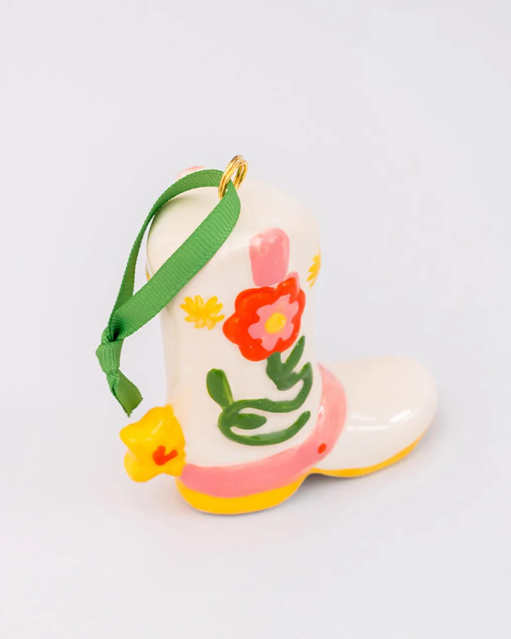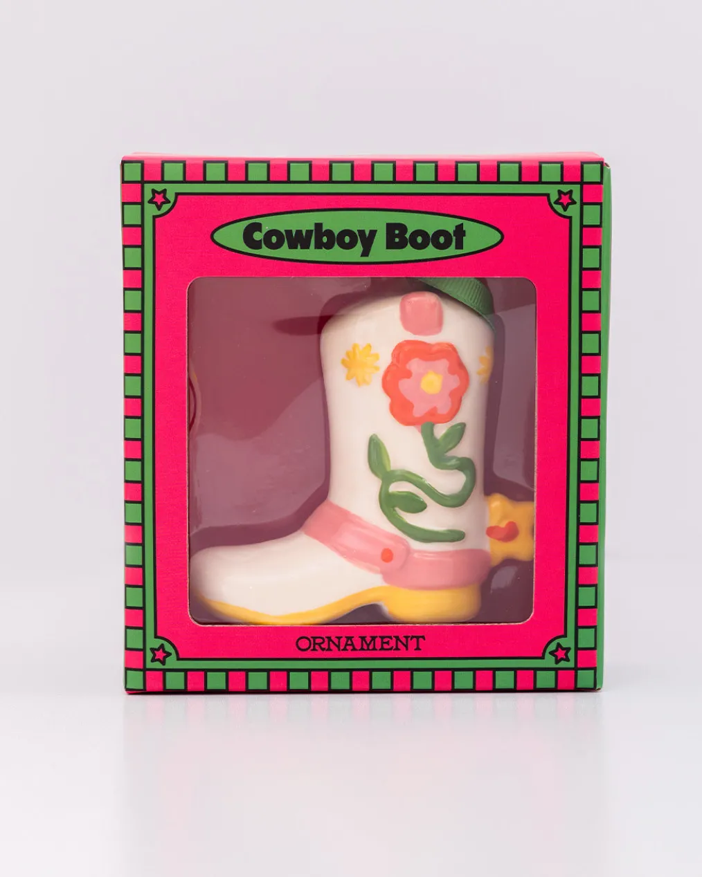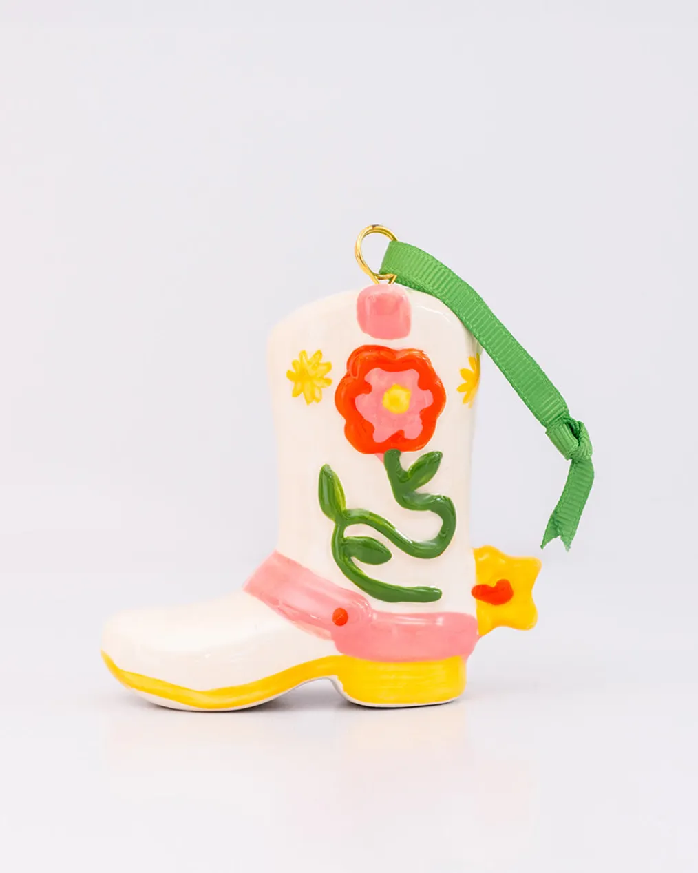 Howdy, partner. This boot ornament is made of ceramic, and it can’t wait to hang on your tree or sit real pretty on your shelf.