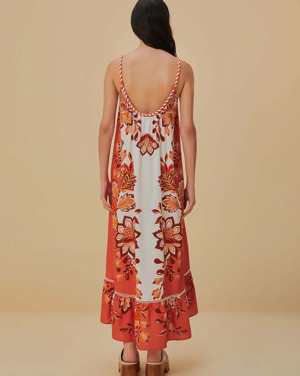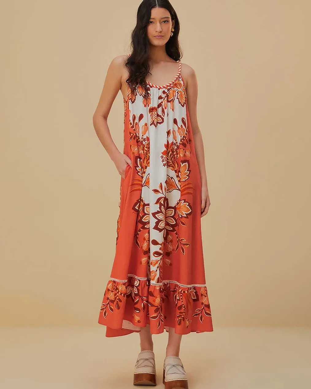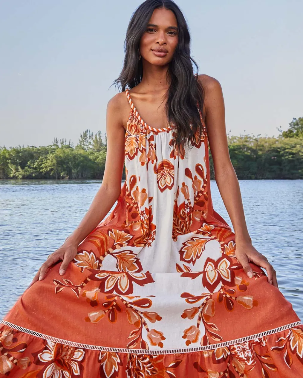Embrace the warmth and vibrancy of the Aura Cream Lenzing™ Ecovero™ Euroflax™ Maxi Dress, an ode to elegance and environmental mindfulness. Swathed in a floral tapestry of creamy whites and rich oranges, this dress dances with a playful hem ruffle and inviting round neckline. Each stride reveals the fluidity of its fabric, crafted with an eye on ecological compassion. Its alluring silhouette promises to enchant, showcasing a bespoke design harmonious with the world it inhabits. European Flax™: certified GMO-free plant fiber produced without artificial irrigation that has guaranteed traceability and proven comfort, thermoregulation, moisture management, and breathability. 100% LENZING™ ECOVERO™: the eco-responsible fibers generate up to 50% lower emissions and water impact compared to generic viscose.