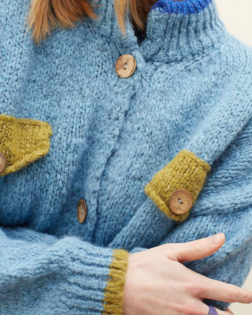 Short chunky knit cardigan with pockets. Straight cut and long sleeves. Wooden buttons. Chest pockets. Cowl collar. Contrast color details.