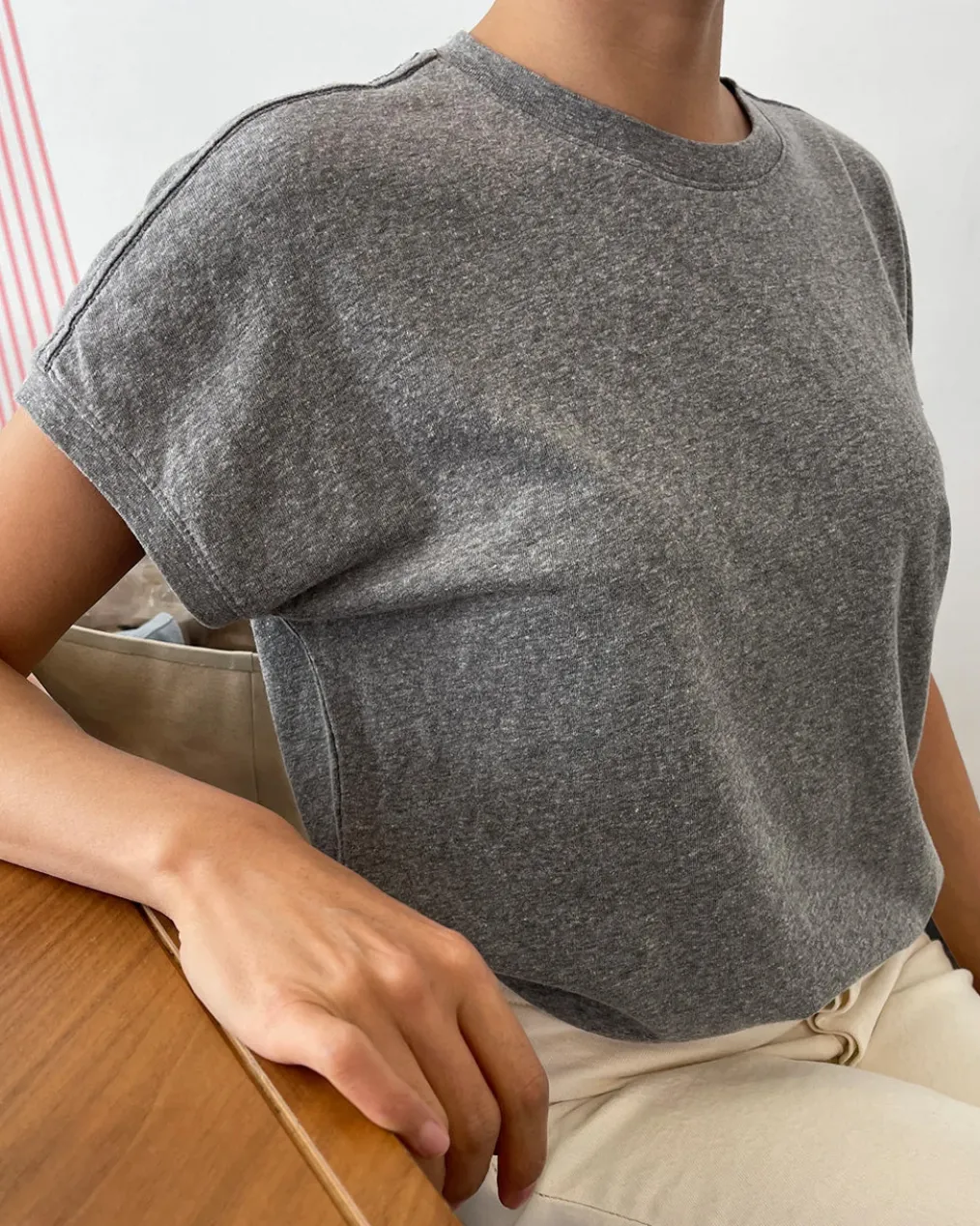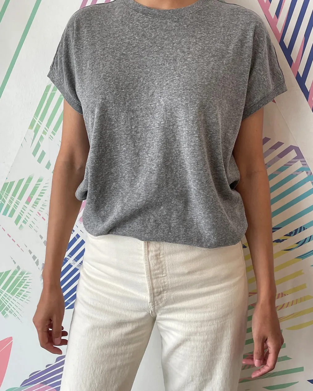 Ease Tee is an edgy dolman tee. She features a high crew neck, shoulder coverage without a sleeve, slightly rounded hem and a contrast rib banded sleeve opening and neck opening. With a crisp color palette and enough length to tuck in or out she is a cool girl’s uniform.
