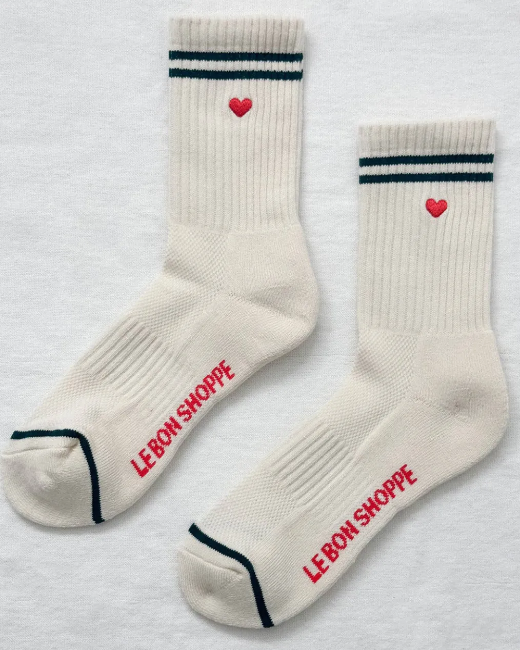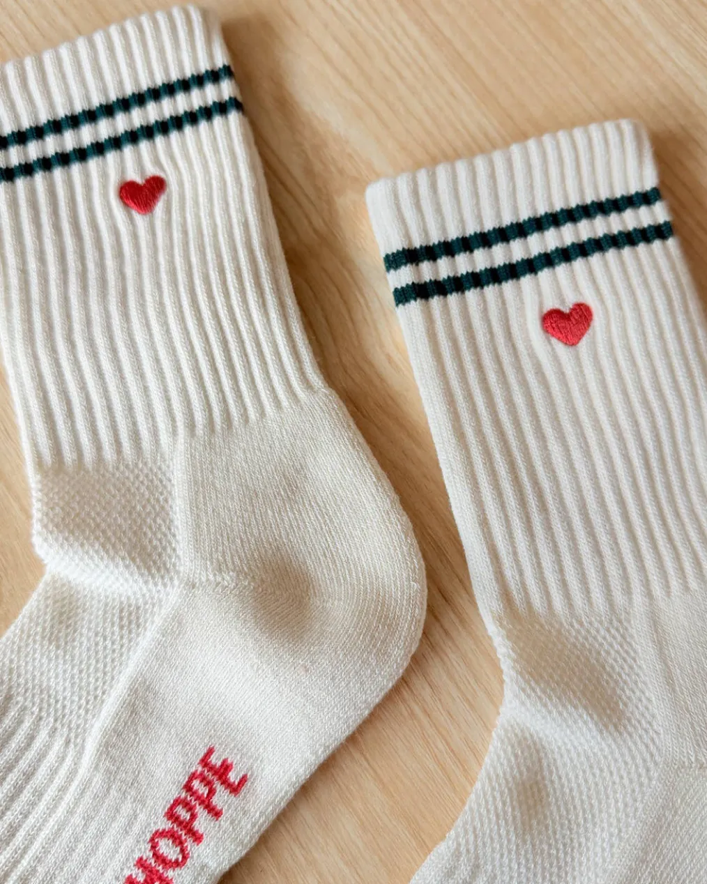 The classic Boyfriend socks you know and love, now with a little extra love. This year-round best seller maintains the perfect mix of function and fashion, creating an effortless sporty vintage charm to any outfit. It’s slightly longer than a classic crew and has a contrast double stripe. A fun, embroidered heart sits just below the stripes for an endearing touch, making them the perfect pair to gift or soak up all the love in yourself.