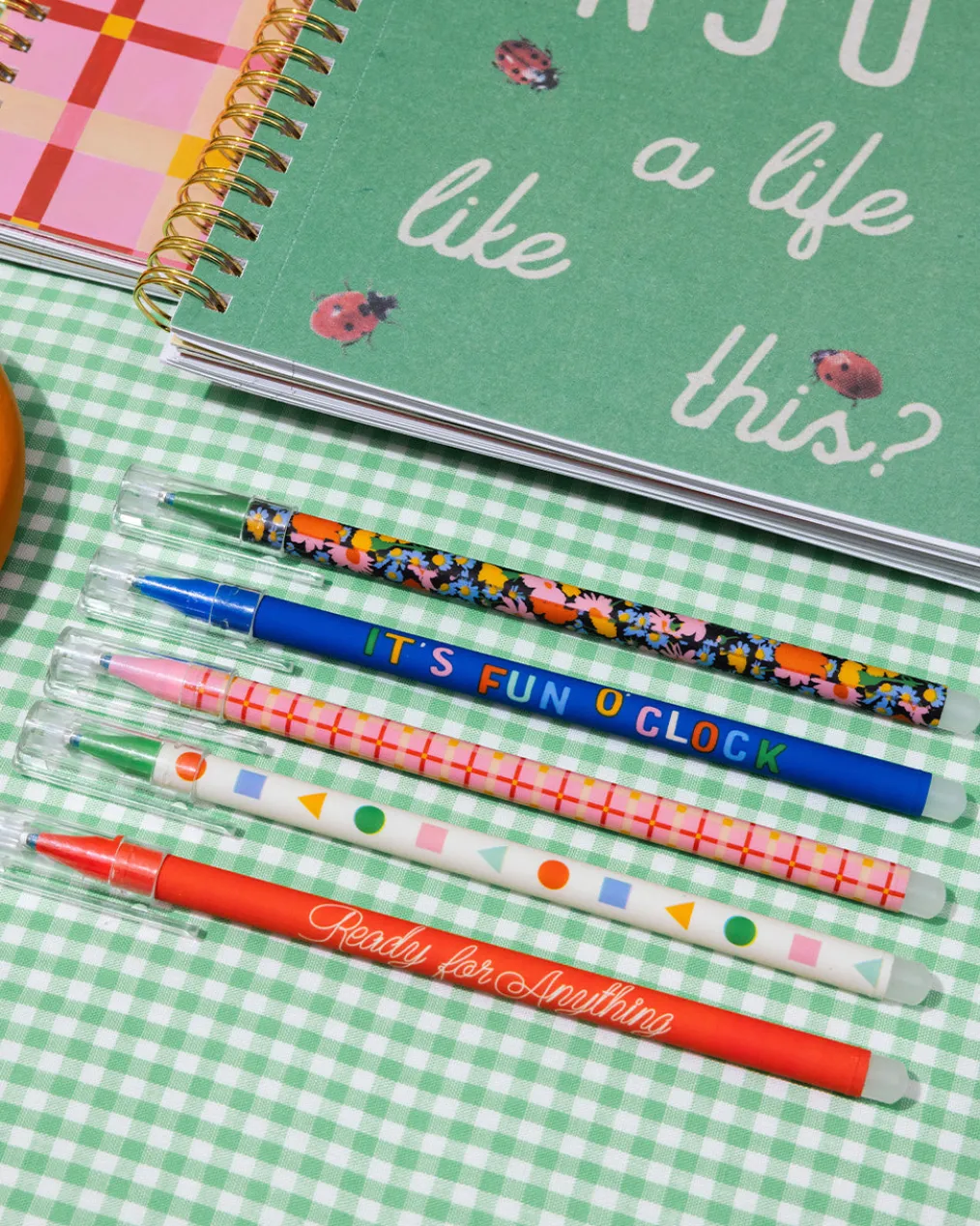 Erasable pens = the best of both worlds. This set features black ink, caps with clips, and five unique designs.