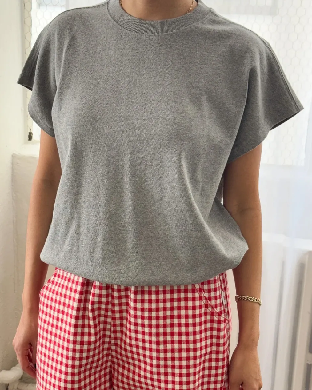 A refined twist on a classic silhouette, the Fei Tee takes design cues from the Jeanne Tee, such as its boxy frame and cap sleeves. It also adopts newer elements from the Daisy Long Sleeve Top like an elasticated hem. This feature offers a fun alternative to tucking in the tee, creating effortless volume — perfect for pairing with high-waisted bottoms.