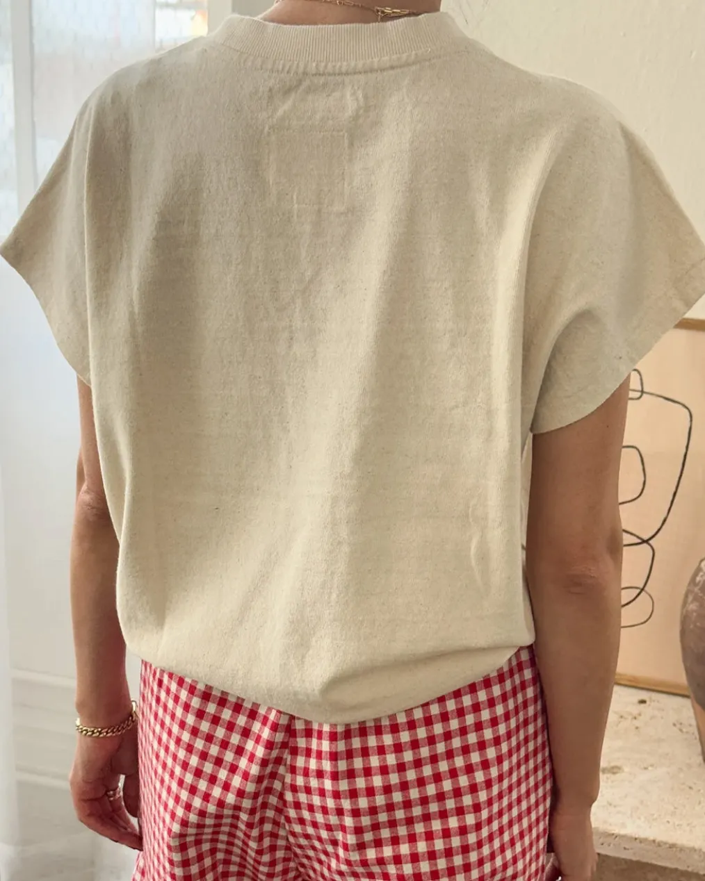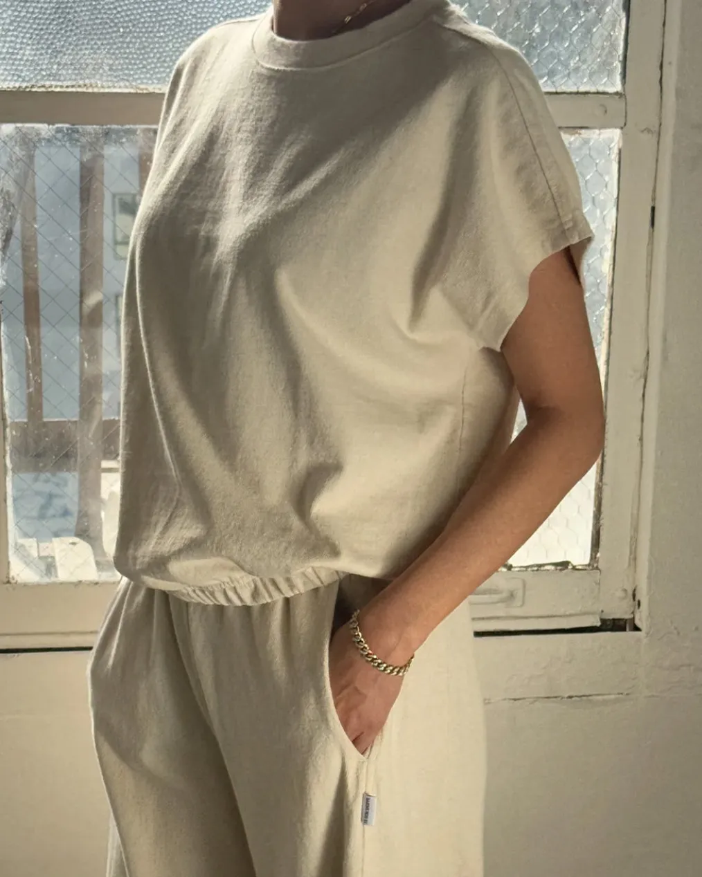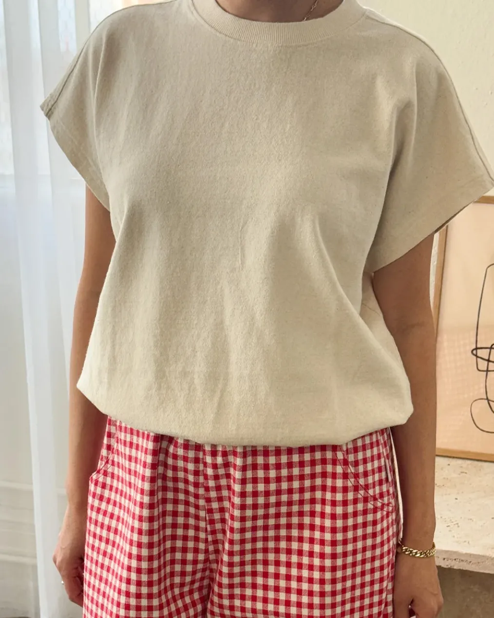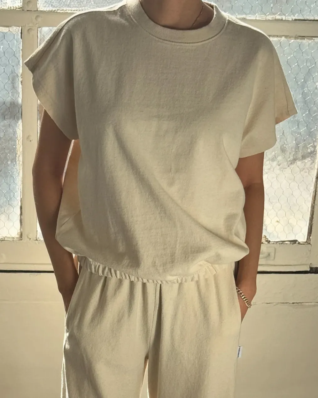 A refined twist on a classic silhouette, the Fei Tee takes design cues from the Jeanne Tee, such as its boxy frame and cap sleeves. It also adopts newer elements from the Daisy Long Sleeve Top like an elasticated hem. This feature offers a fun alternative to tucking in the tee, creating effortless volume — perfect for pairing with high-waisted bottoms.