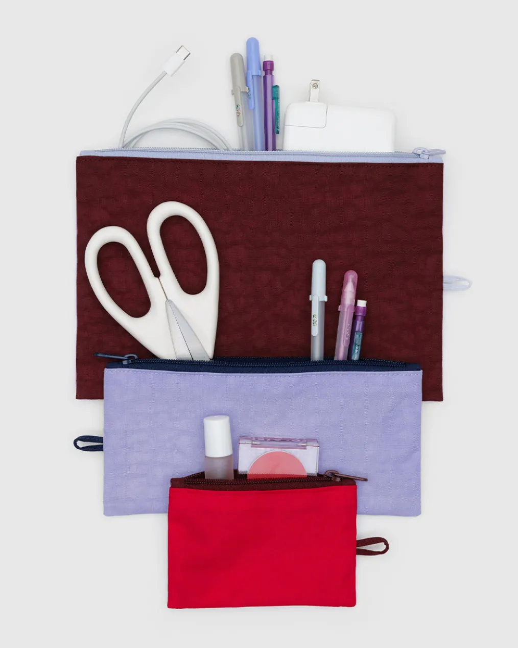 Pouches with possibilities. From Baggu, this set of three is made with a machine-washable nylon and each has a zip closure.