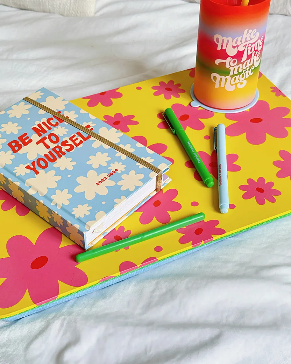 Because sometimes working from home becomes working from bed. This bright lap desk comes with a cushy bottom and a cup holder.
