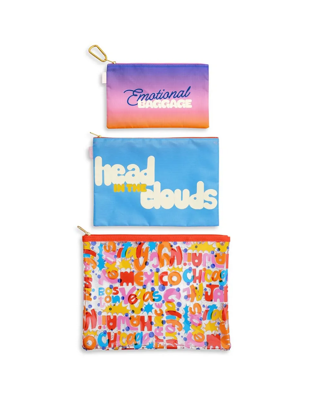 Vacation preparedness is no laughing matter. This set includes three pouches (one is water resistant!) that can nest inside one another or be clipped together with the included carabiner.