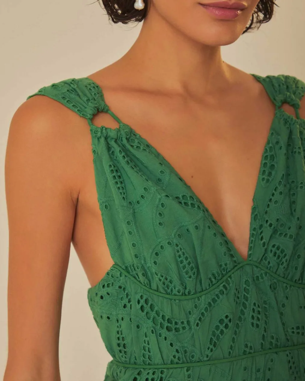 Embrace tropical elegance with the Green Monstera Corset Eyelet Maxi Dress, featuring an alluring V neckline framed by delicate ruffled straps. This eye-catching piece is adorned with intricate eyelet detailing that mirrors the beauty of monstera leaves, all in a lush shade of green. Its corset-style bodice and flowing tiered maxi skirt create a feminine silhouette that dances with every step, inviting you to lose yourself in the rhythm of nature’s own design.