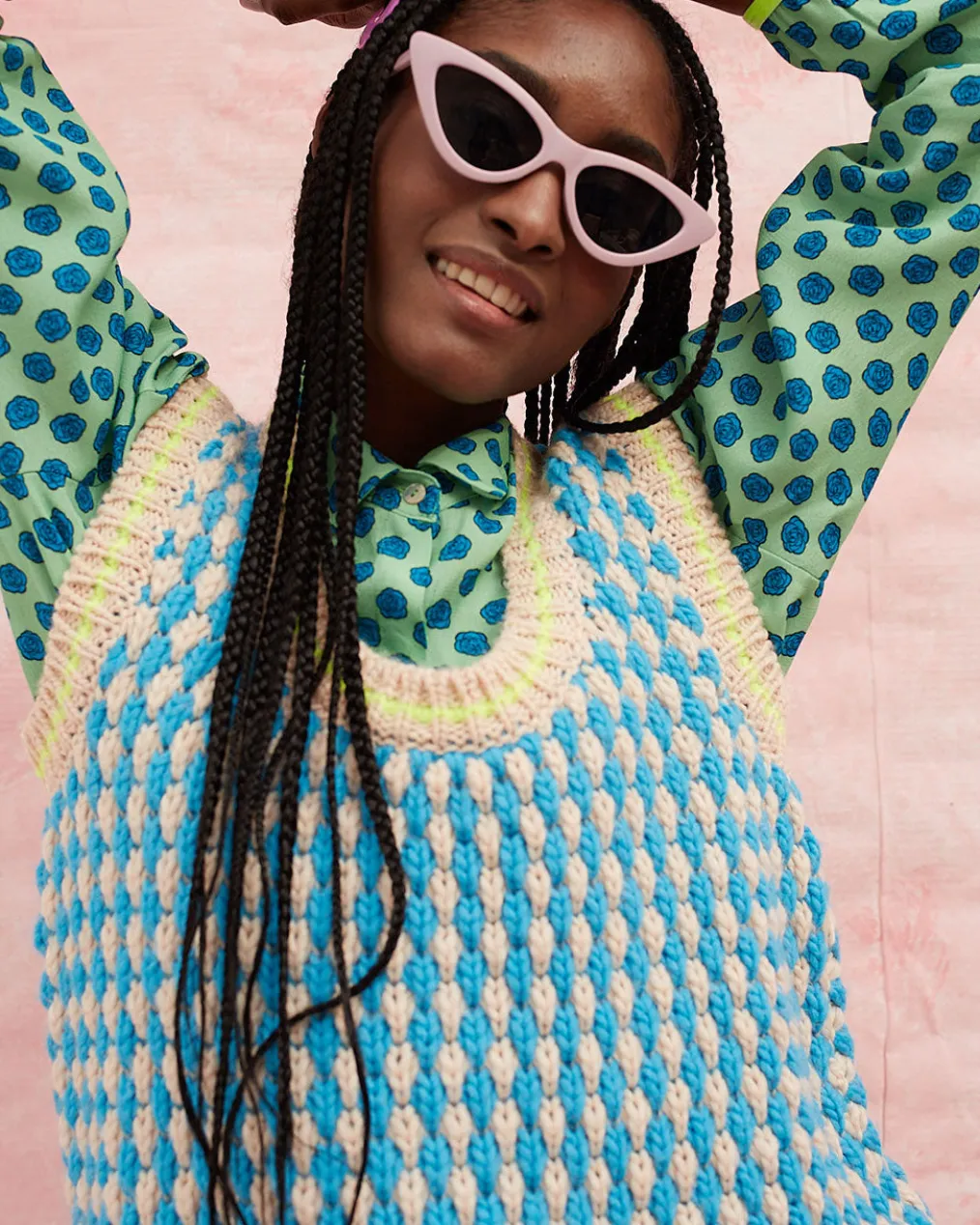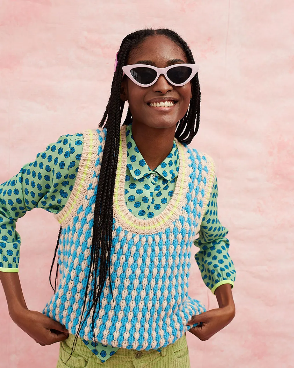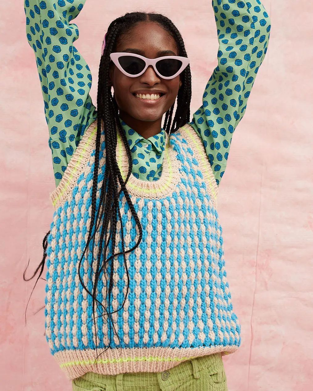 Handmade look vest in chunky knit. Bicolor fantasy stitch. Detail of fine contrasting color stripe on collar, armhole and hem.