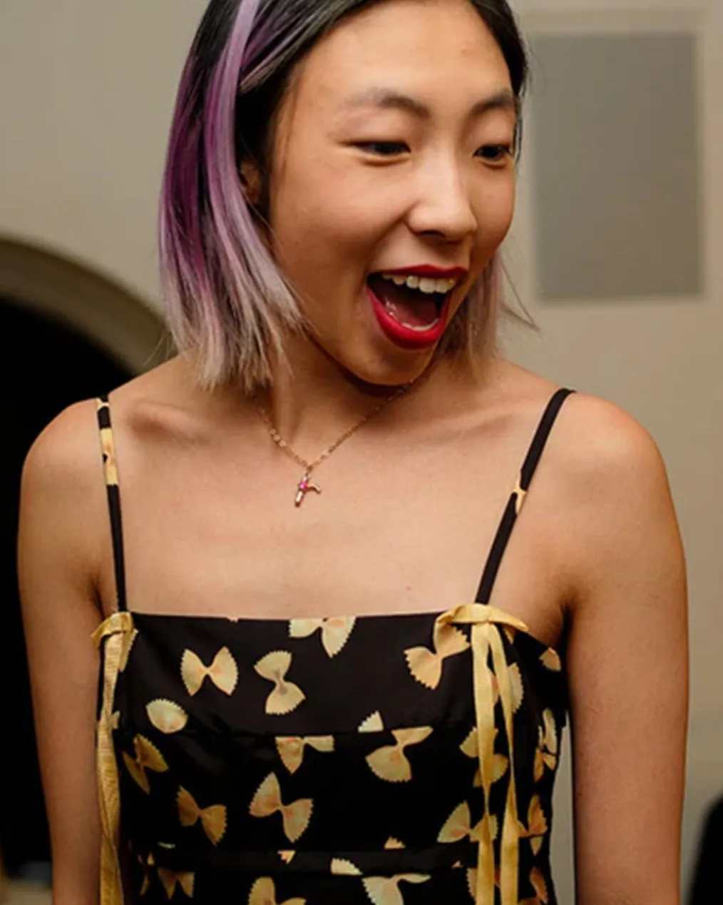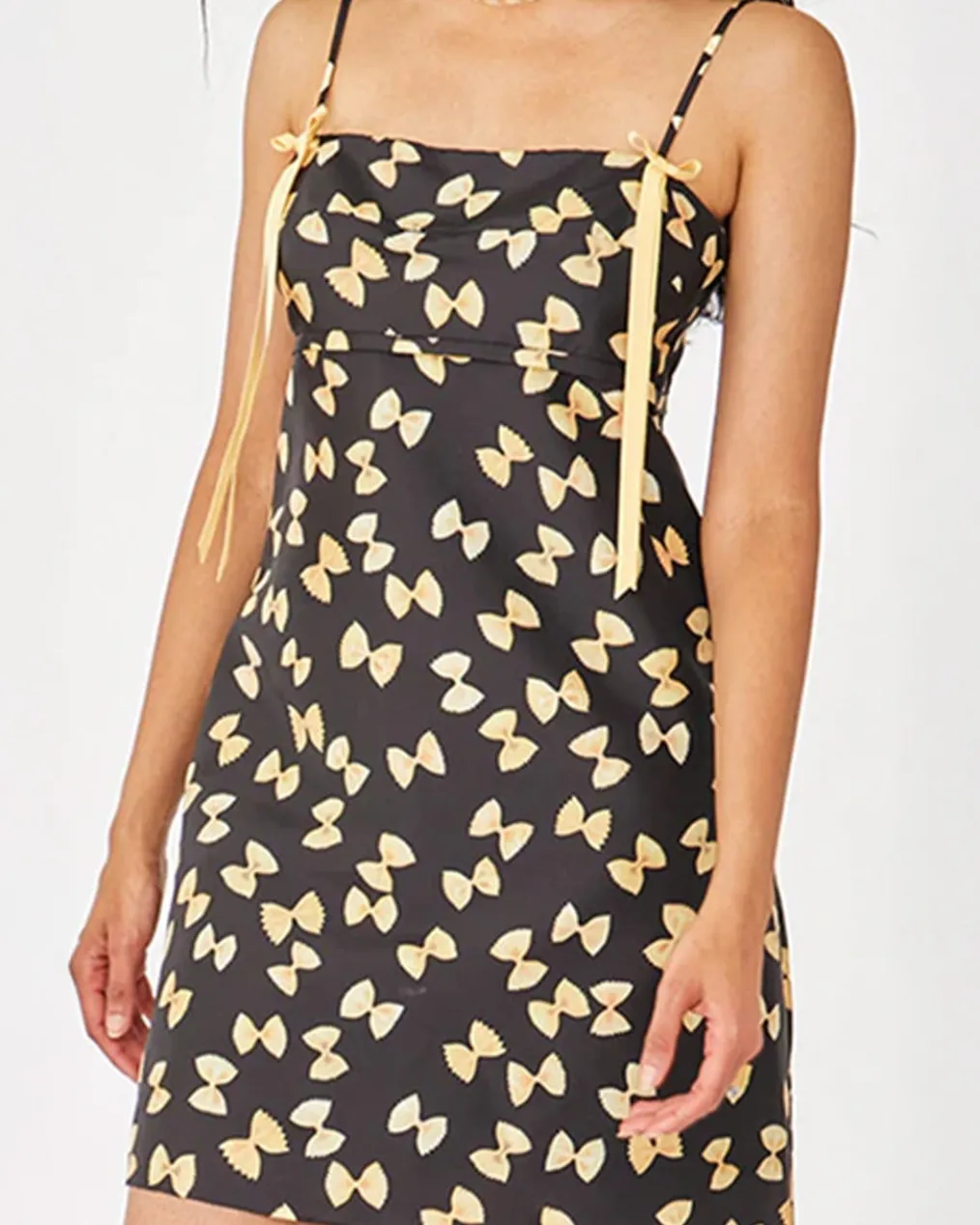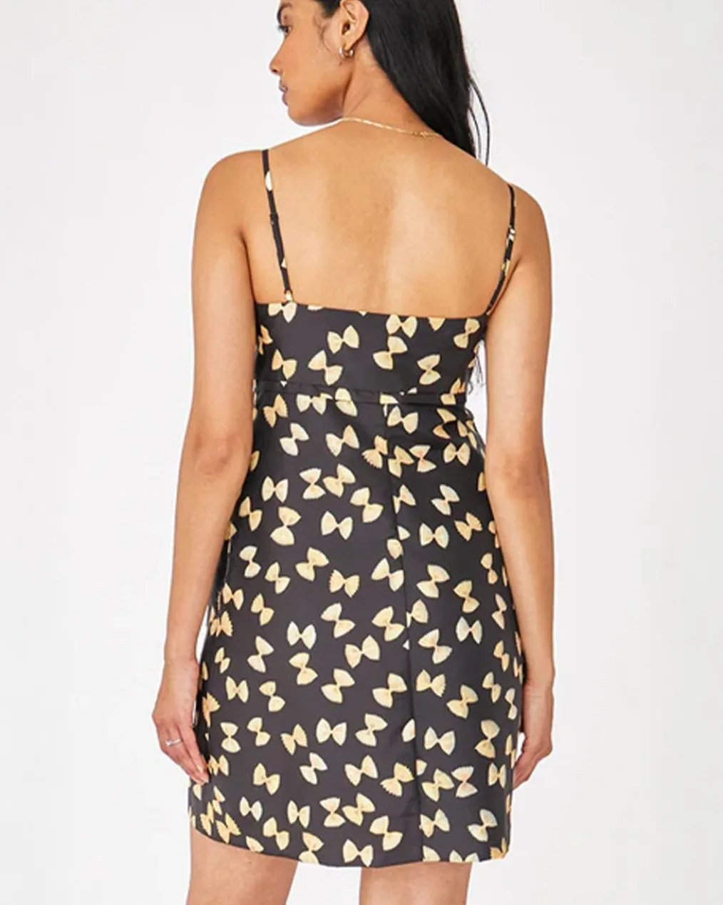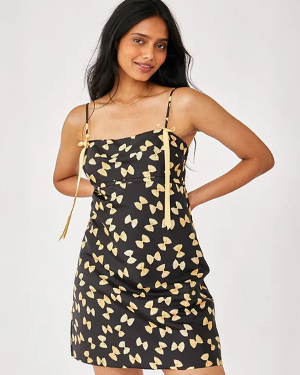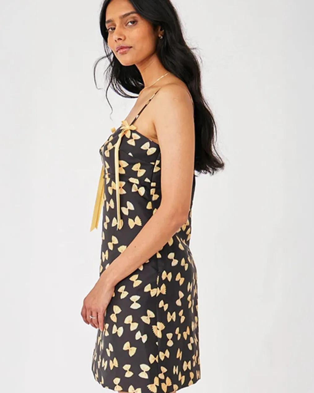Rachel Antonoff’s newest Gwen bravely endeavors to satisfy your craving for bowties two ways! A Sunday supper’s worth of farfalle floats across inky printed taffeta–which, let’s be real, is the fun friend of fabrics–while silky ribbon bows dot each adjustable spaghetti strap. A body-skimming A-line fit and structured bust complete the look; simply add a ballet flat or a bitchy platform, and you’re on your way. Part nineties vixen, part nona’s kitchen, all-you-can-eat style!