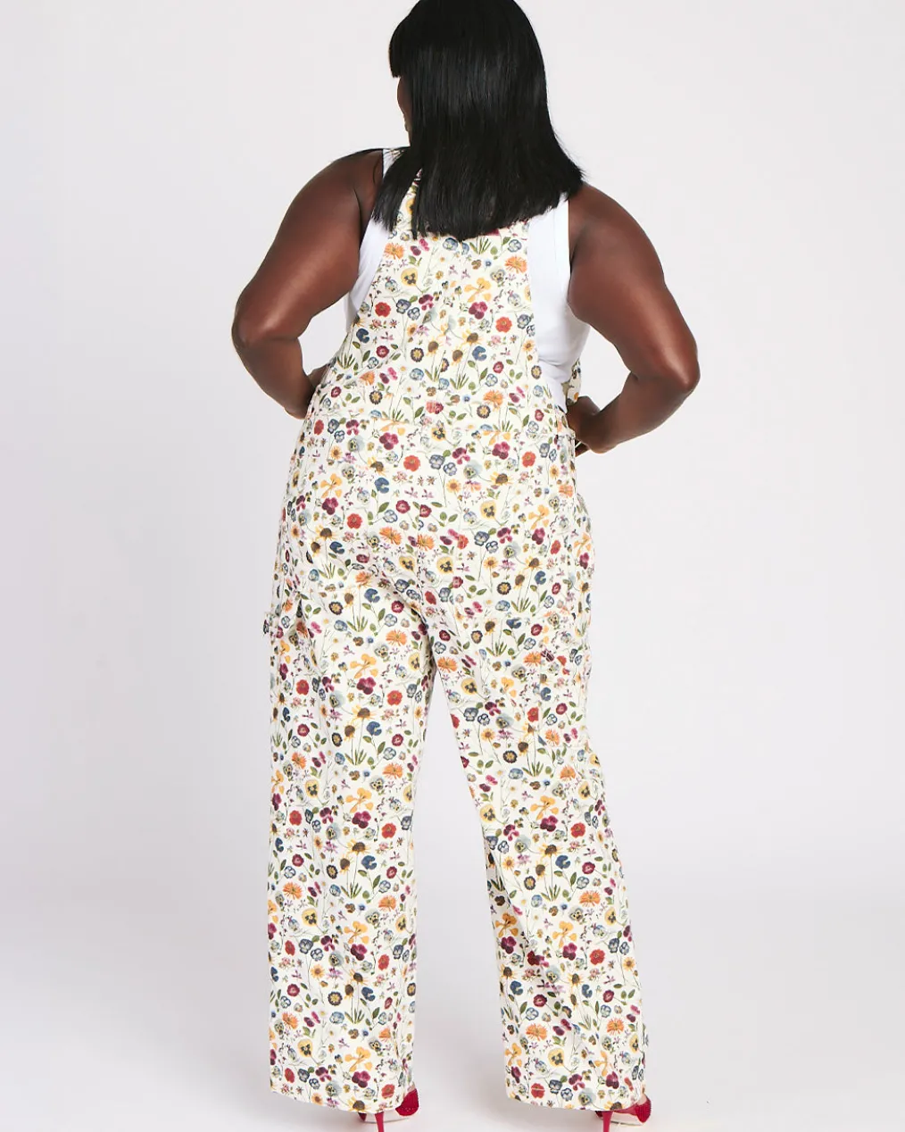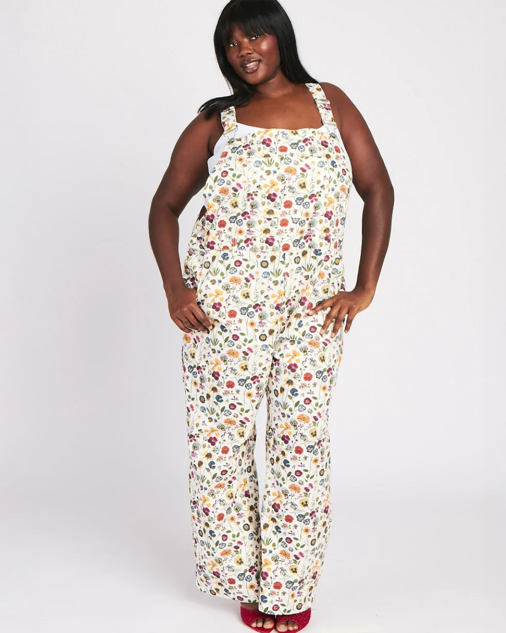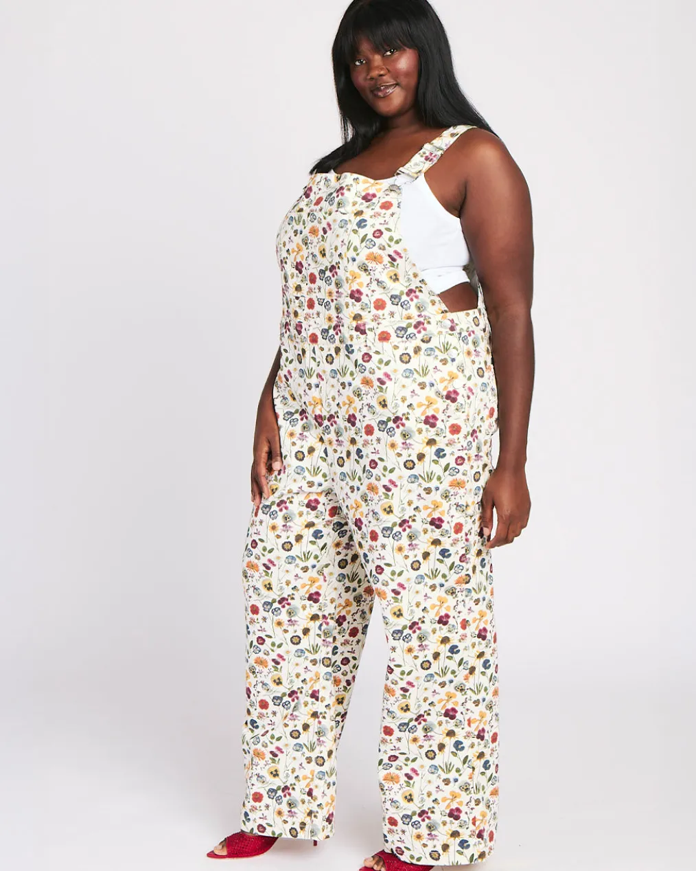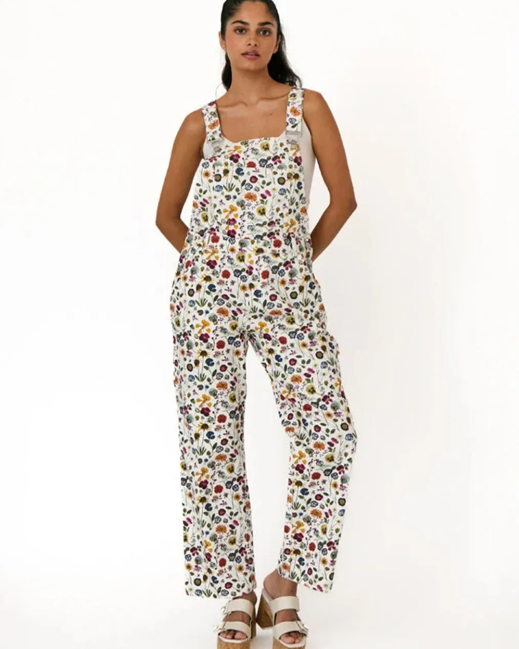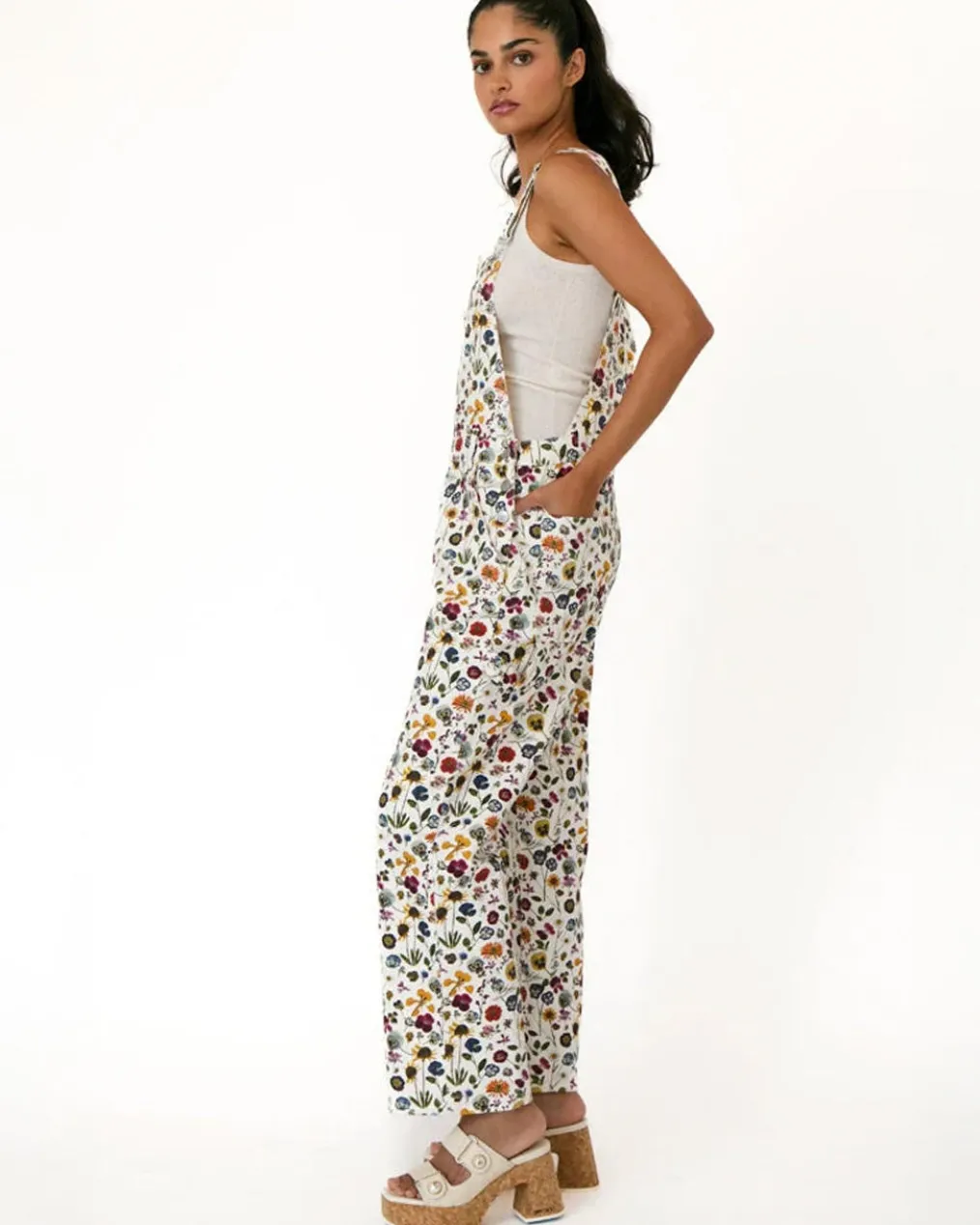 - White printed denim overalls with adjustable suspenders