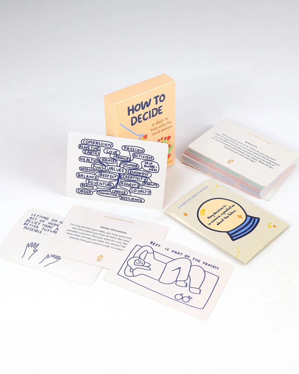 The How To Decide deck offers different frameworks for thinking about the situation you are in and picking a route forward. When you feel stuck, choose an exercise or thought-experiment and see what comes up.