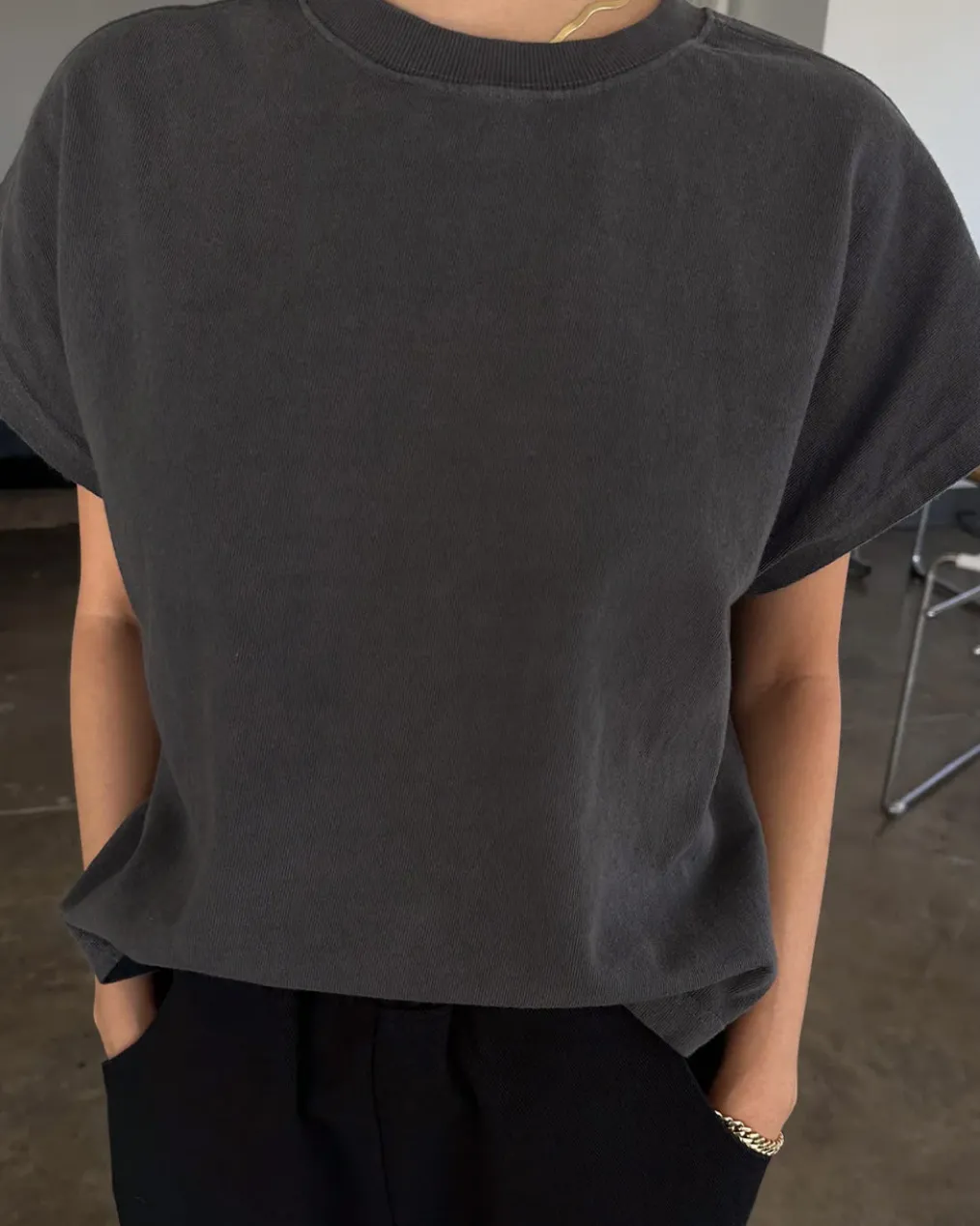 Jeanne Tee is Le Bon Shoppe’s perfect muscle tee. She features a shorter length to pair perfectly with high waisted bottoms but still give enough coverage for mid-rise bottoms and just the right amount of off shoulder dolman sleeve. She has a high crew neck with an extra wide neckband that adds to her signature charm.