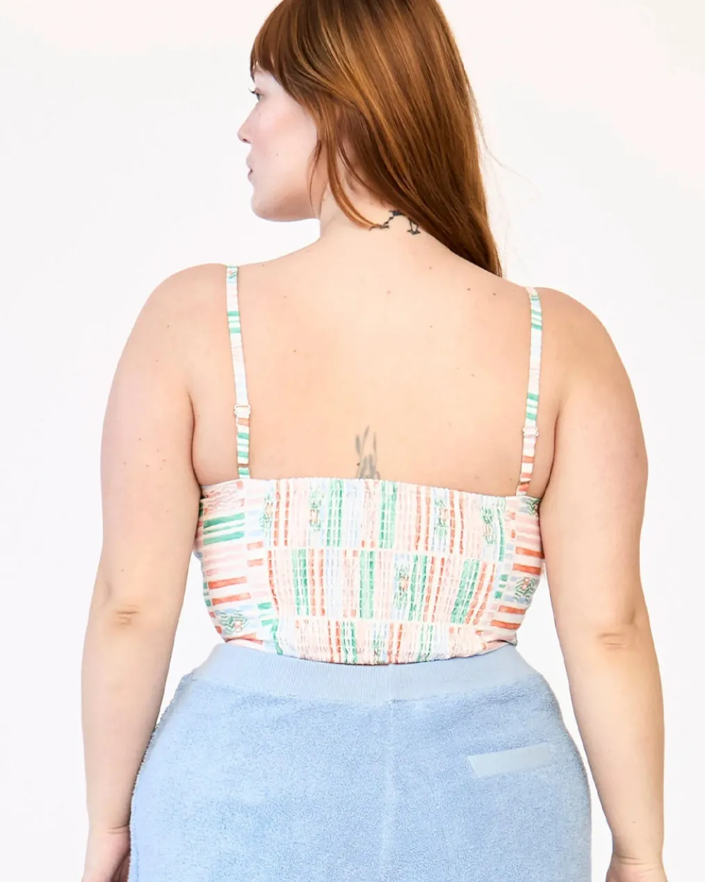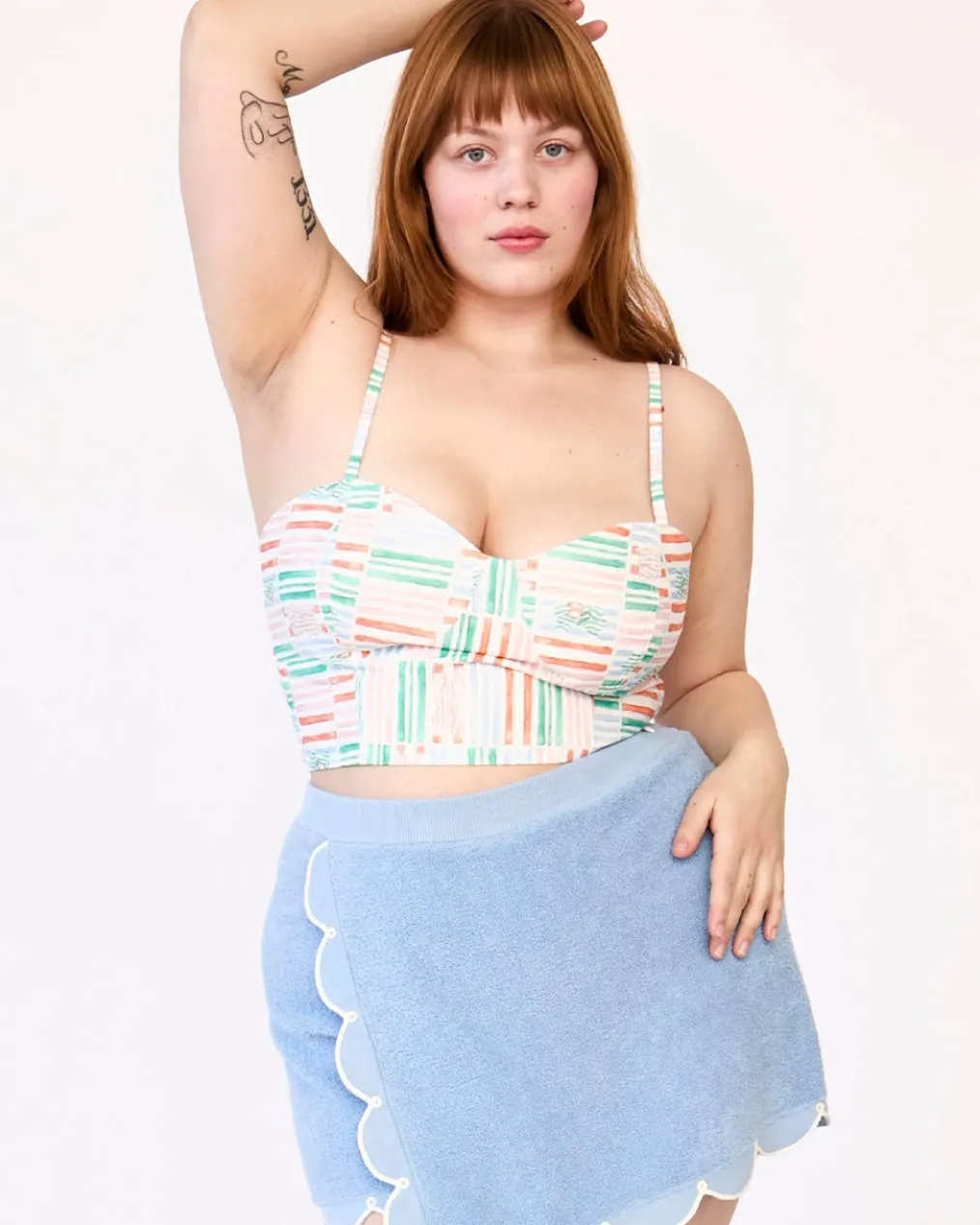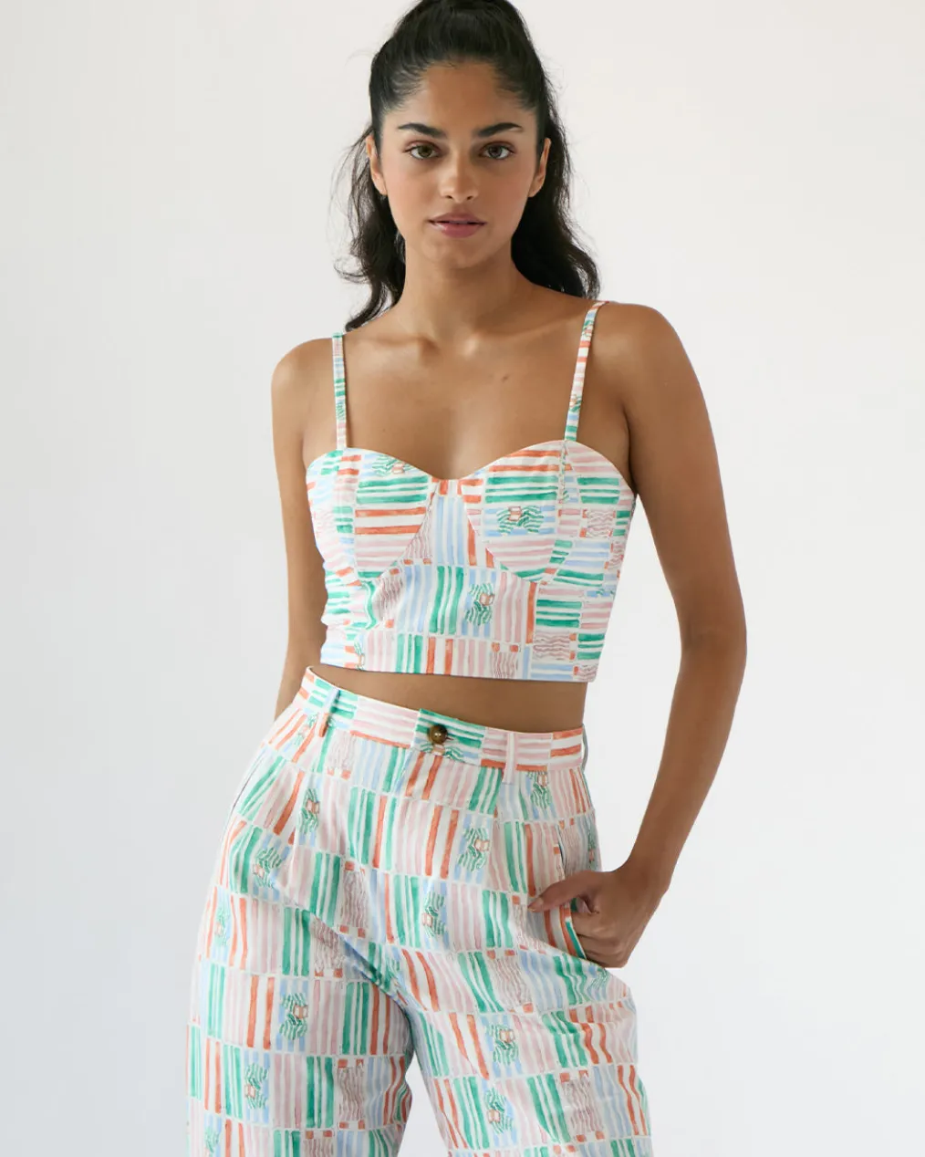 A patchwork of beach chairs and pool towels grace Keller’s bustier silhouette, casually tousled as if their tiny owners just dove into your cleavage. Rachel Antonoff’s newest spring top’s structured bodice makes it a perfect choice for date night, while the adjustable spaghetti straps and 100% cotton twill construction promise to keep your pits fresh in even the most humid or awkward environments.