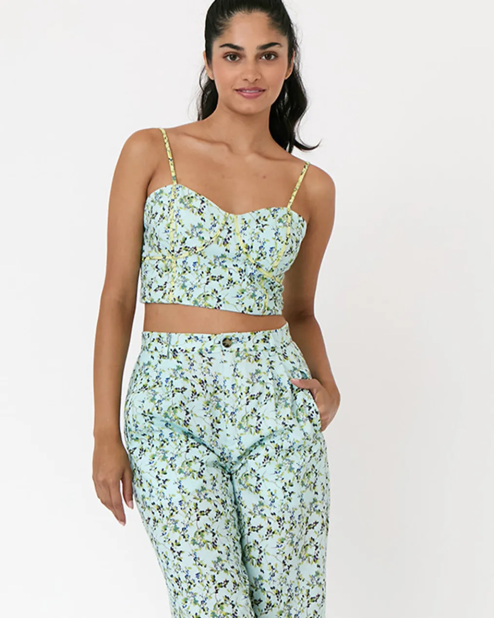 Sometimes sweet, sometimes sour, often blue: blueberries, they’re just like you! Celebrate everyone’s favorite oatmeal topping in Keller, a baby blue crop top with subtly provocative yellow piping along the bust. Match patterns while mixing proportions with the complimentary wide-leg Rose pant, or pair Keller with your favorite faded jeans and a kicky boot.