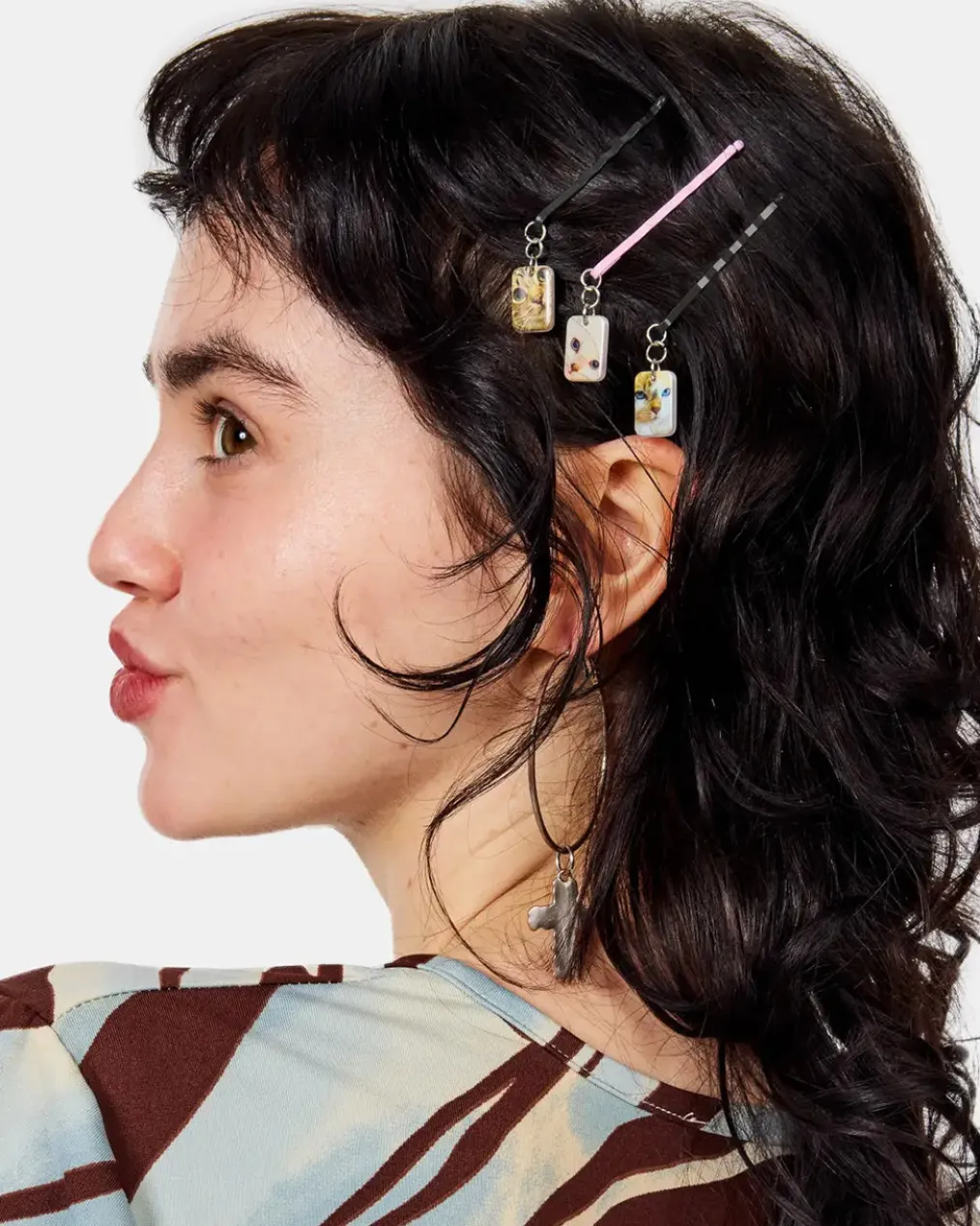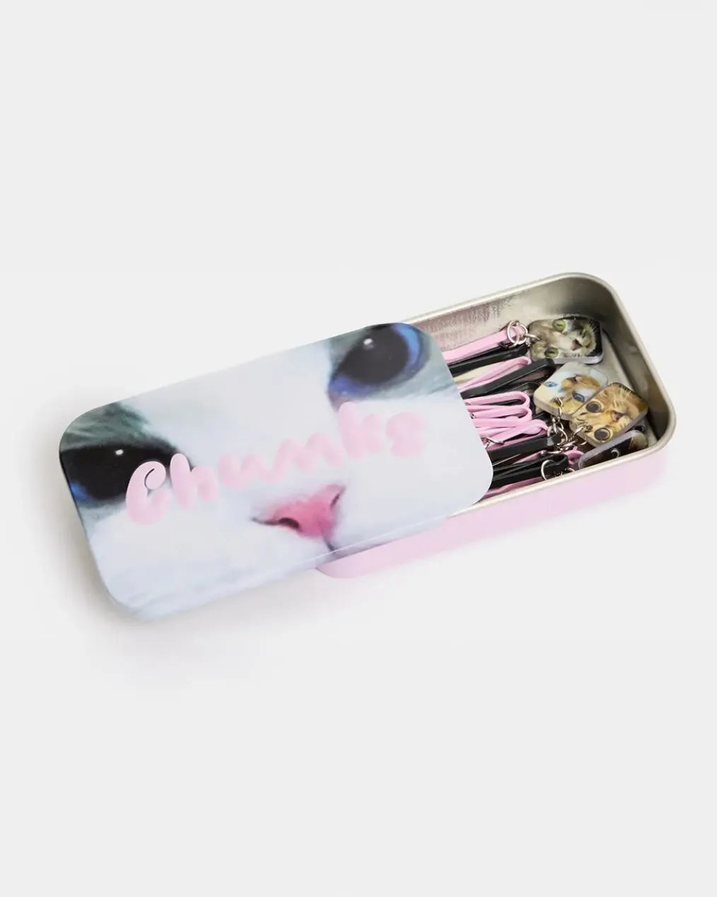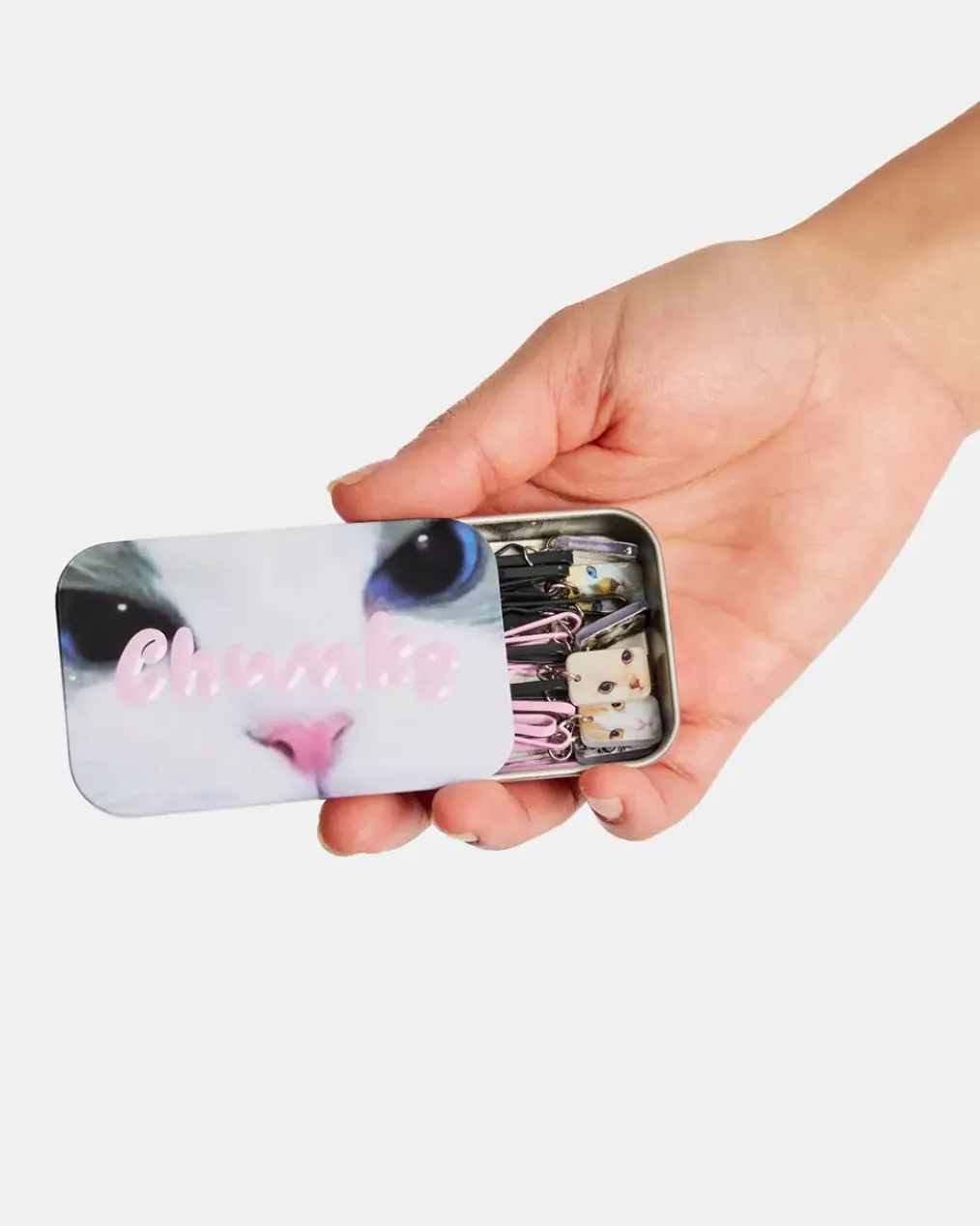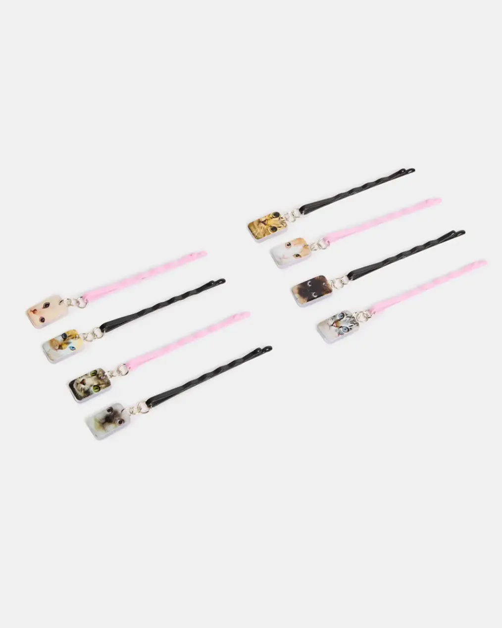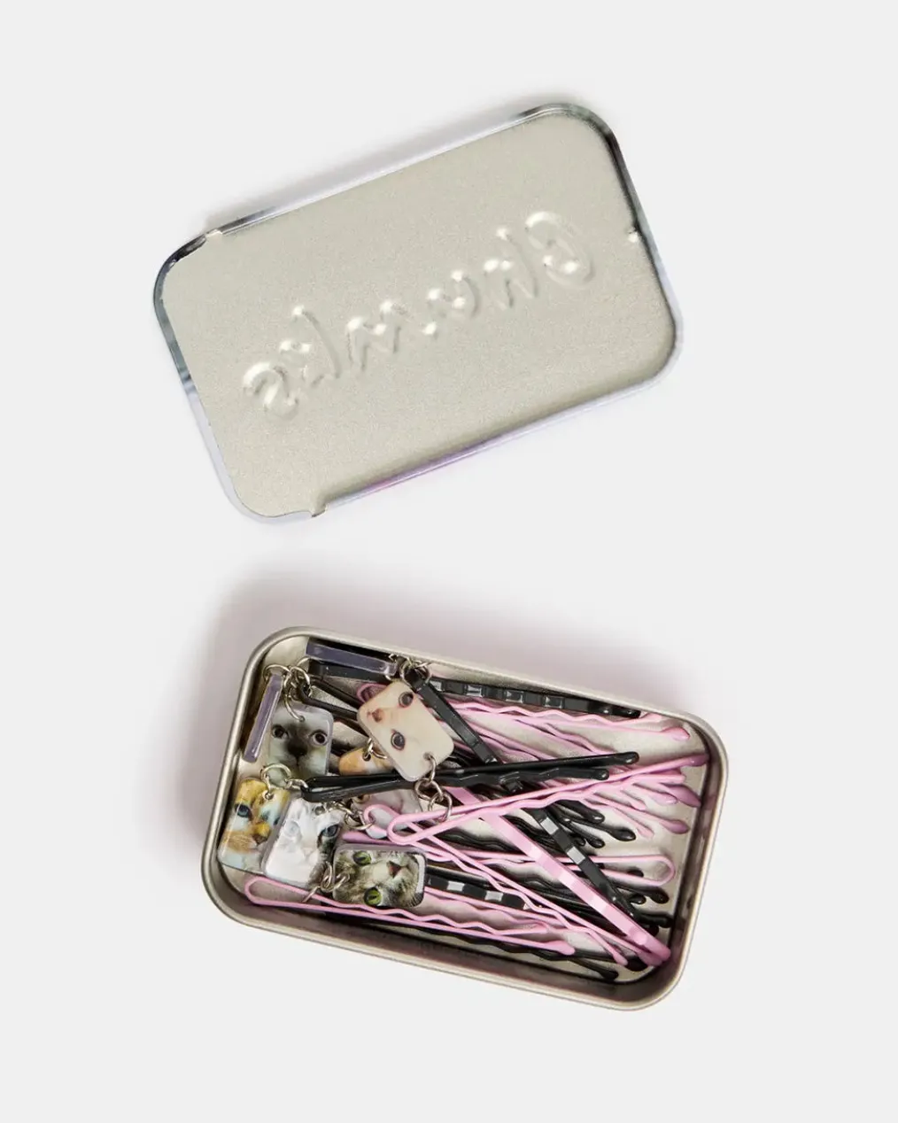 A set of 20 black and pink, enamel-coated bobby pins and 8 kitty acetate charms. Comes in a colorful, reusable metal tin.