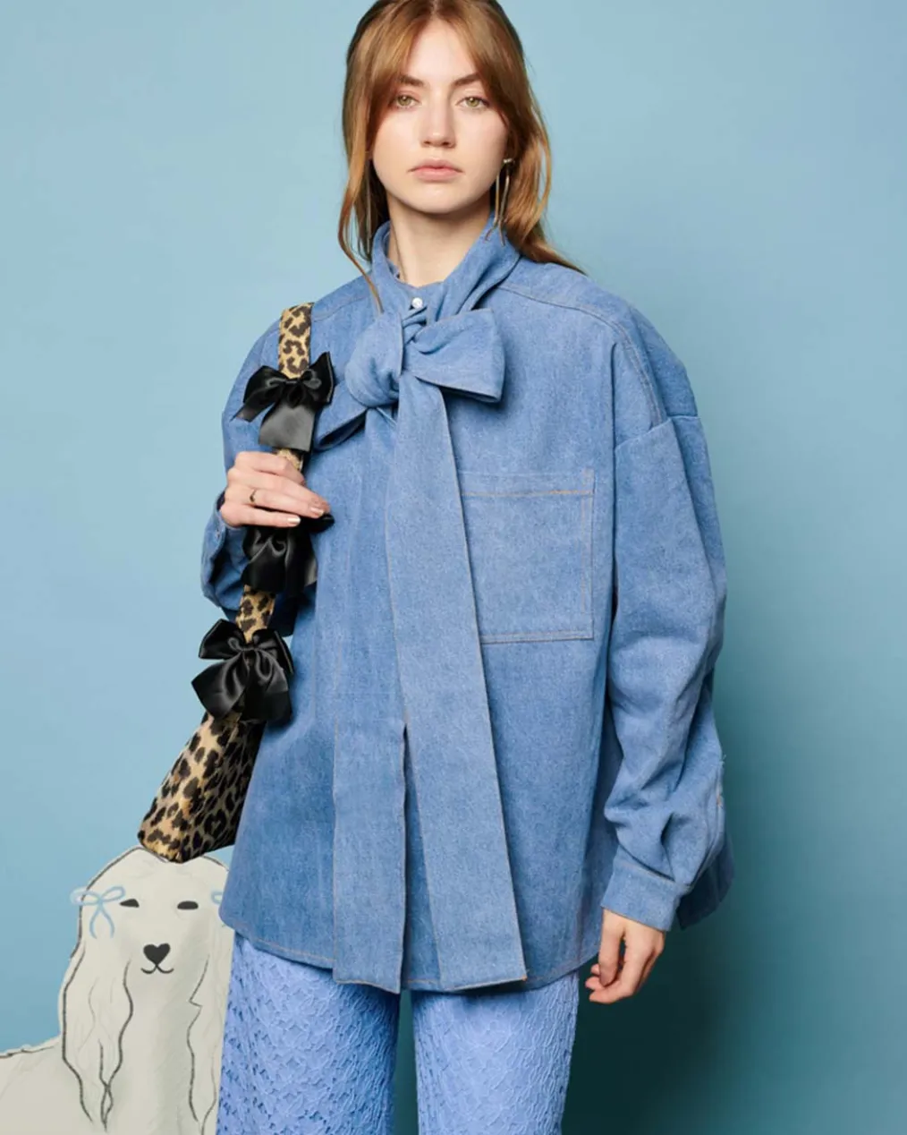 Elevate your casual wardrobe with the Lincoln Denim Bow Shirt. Crafted from mid-wash denim, this boxy-fit shirt features contrasting topstitching and a handy front patch pocket. Fastened with pearl press studs and finished with a removable extra-long necktie in matching fabric, it offers a stylish twist on a classic staple.