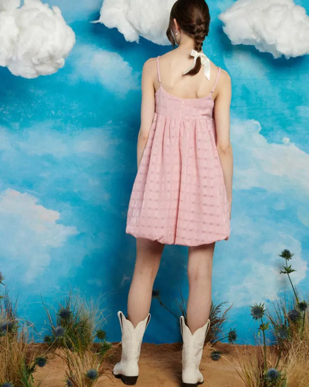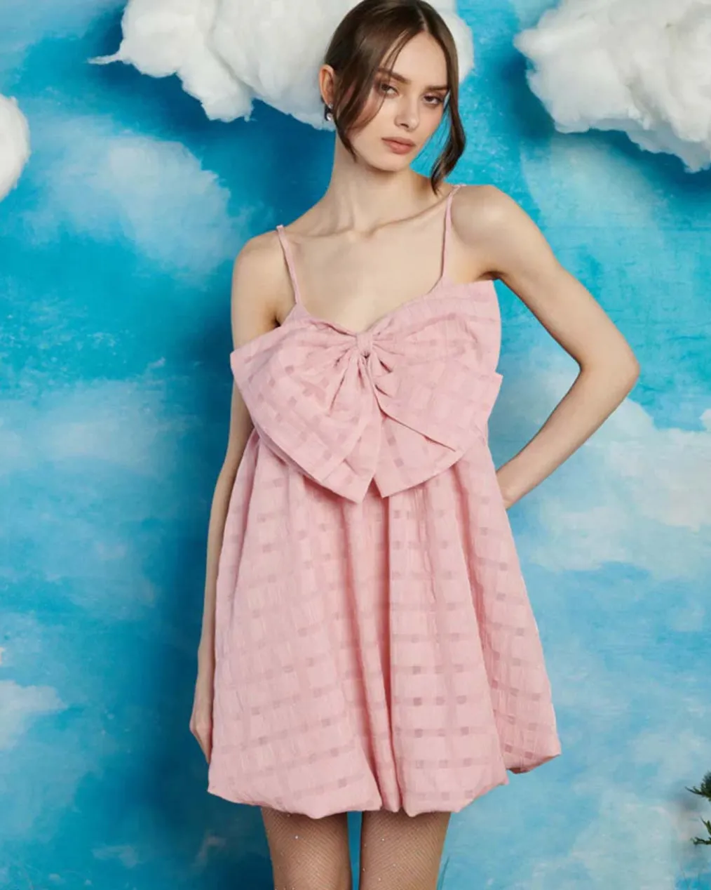Step into delicate elegance with Sister Jane’s Mane Bow Mini Dress, a charming addition to your summer wardrobe. Crafted from a semi-sheer check fabric in a sweet pink hue, mini dress features a tulle-lined bubble hem skirt for playful volume. Perfect for any occasion, this dress exudes a delicate charm that’s sure to turn heads.