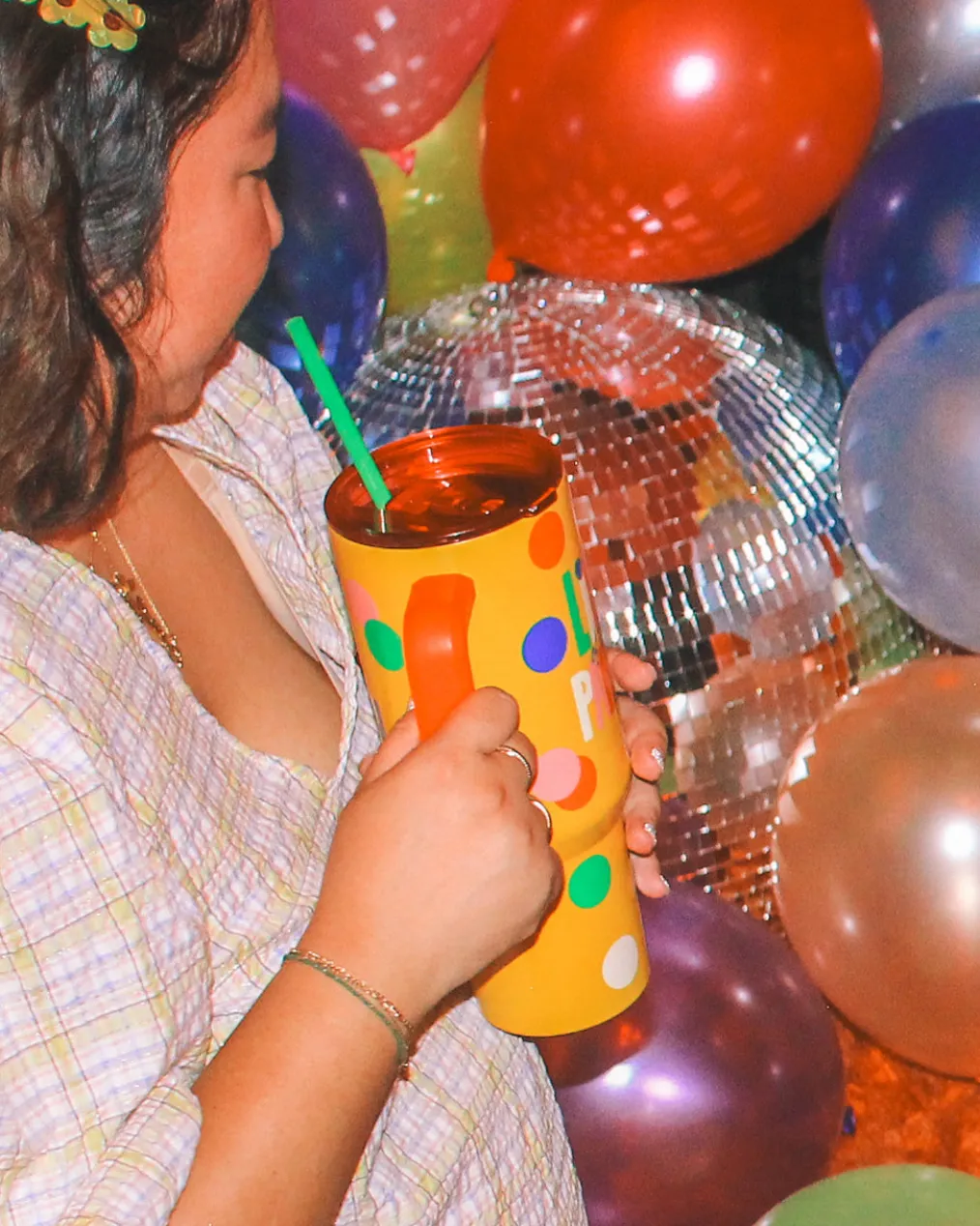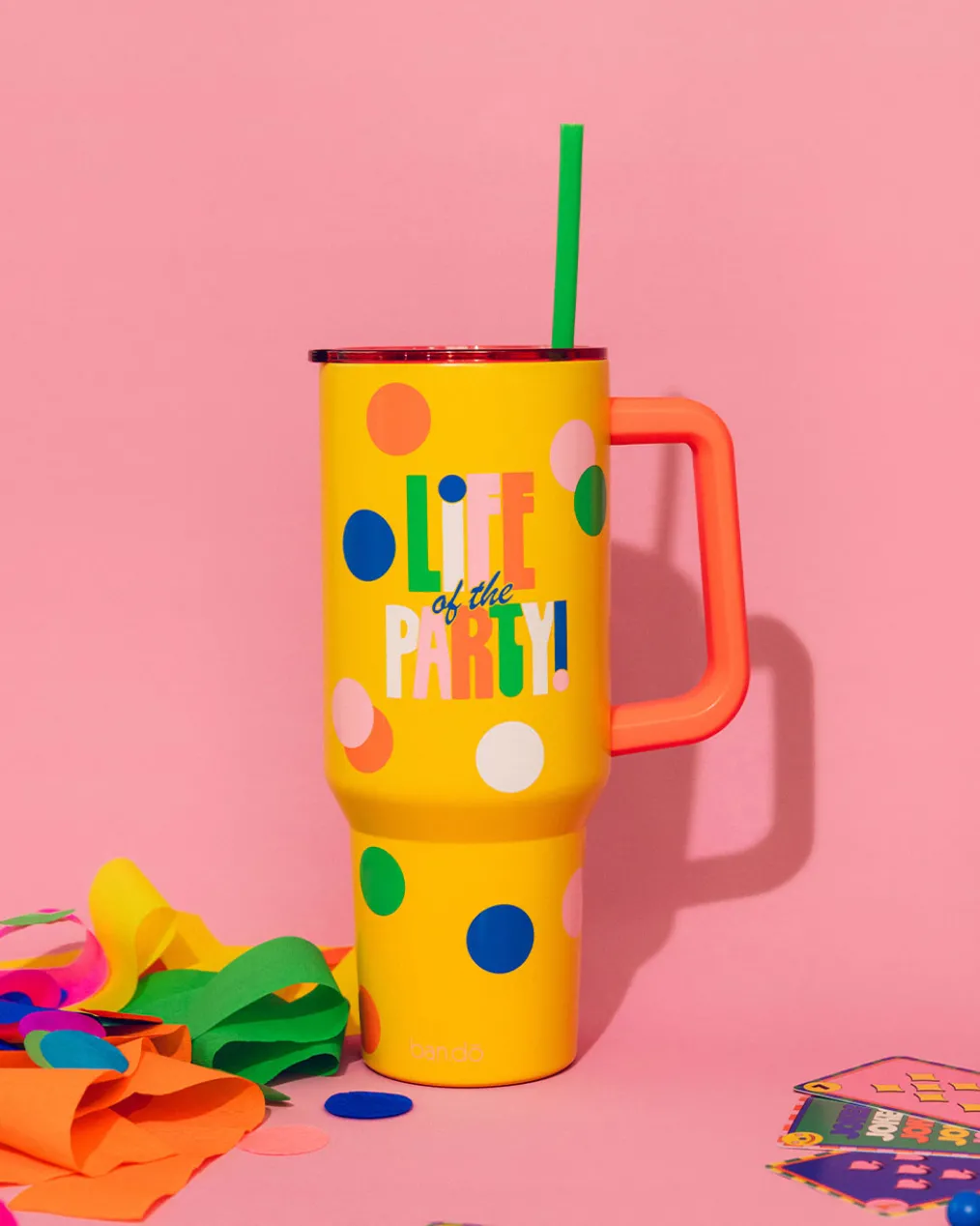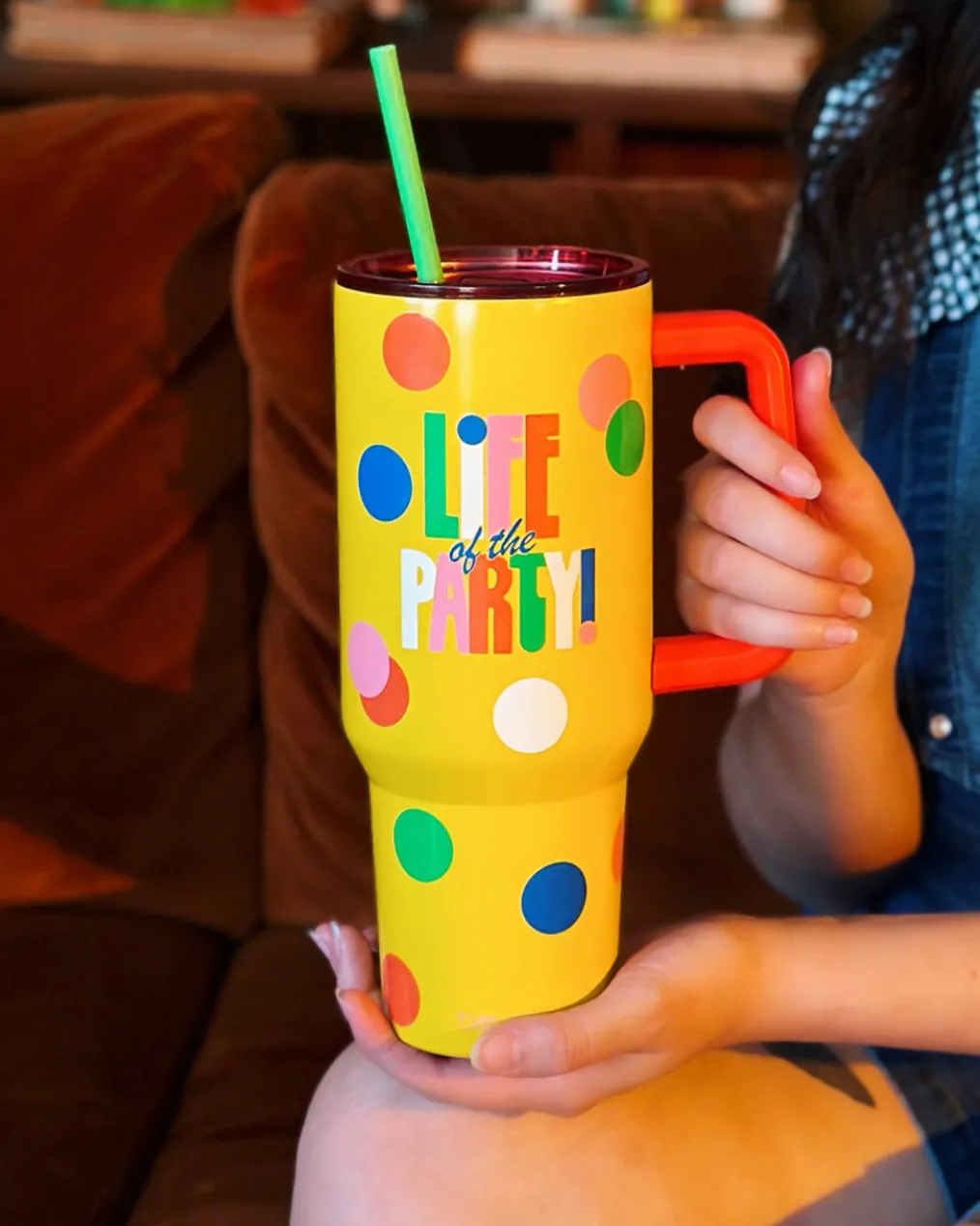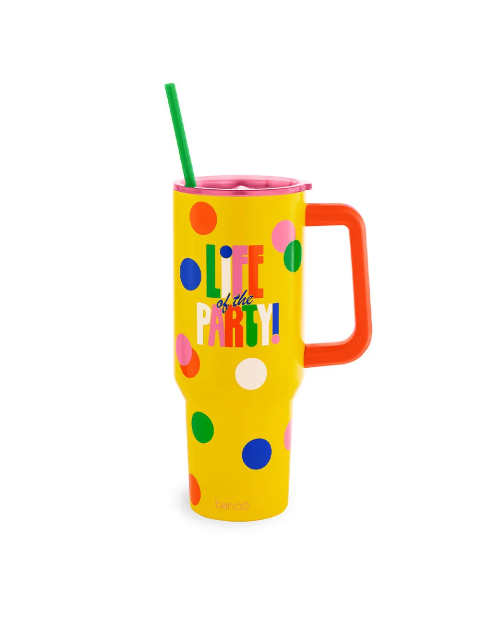 For serious hydration fans only! This stainless steel tumbler has an oversized design, handy handle, and flexible plastic straw.