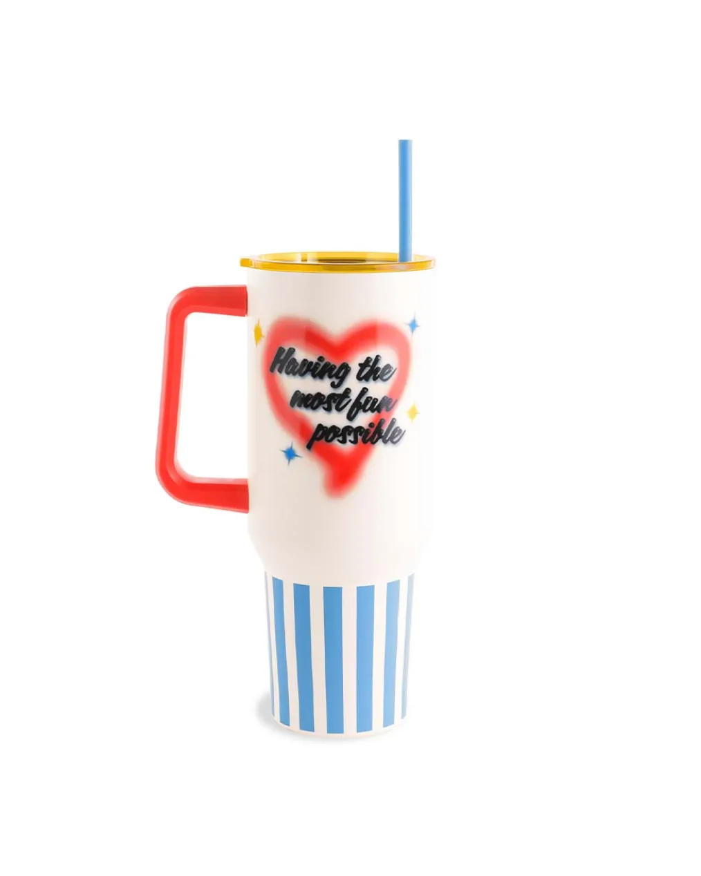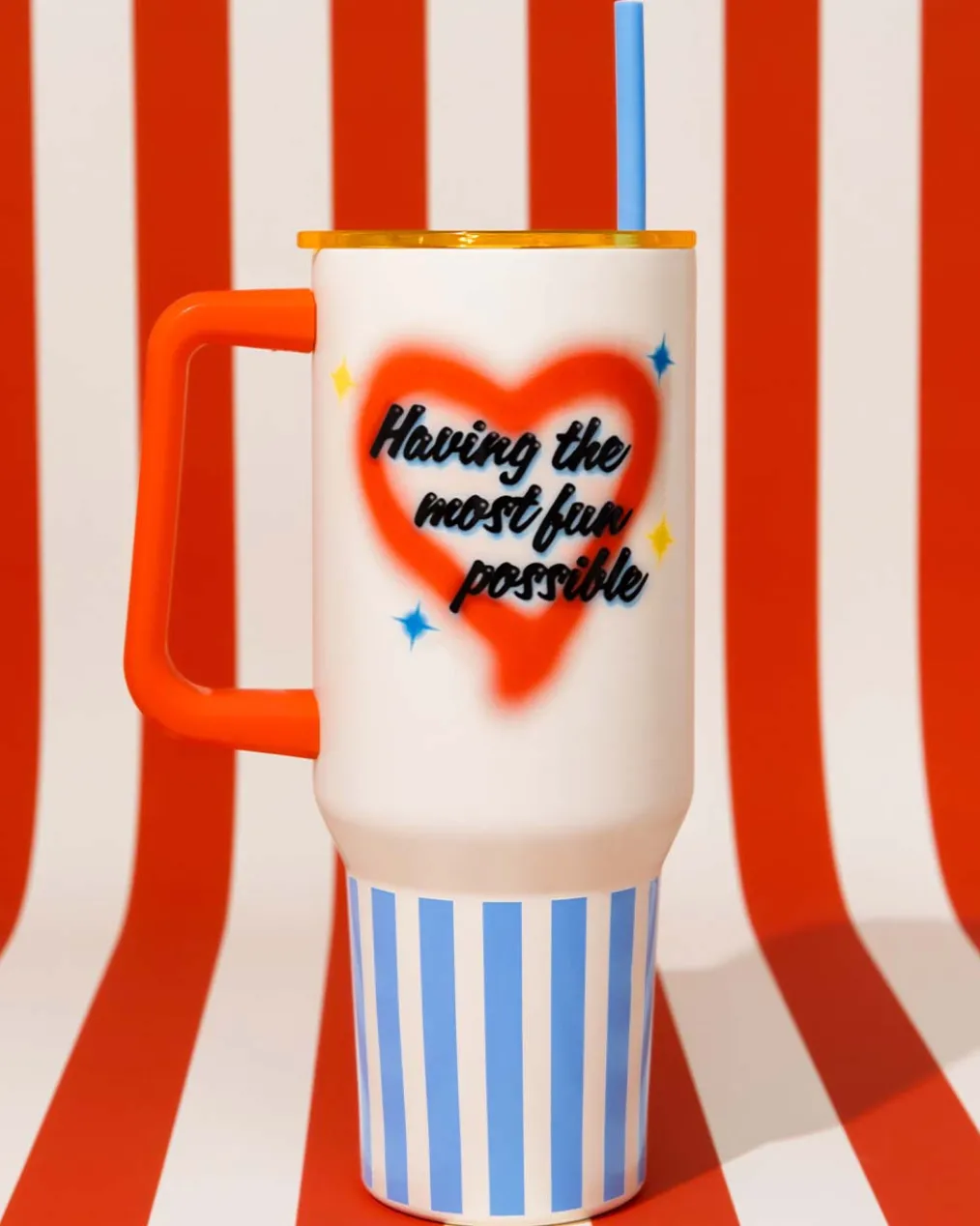 For serious hydration fans only! This stainless steel tumbler has an oversized design, handy handle, and flexible plastic straw.