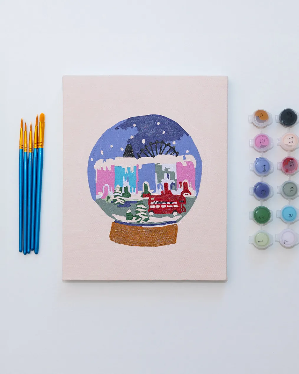 - Includes: 8 in. x 10 in. stretched printed canvas, a set of 5 premium brushes, and 12 pots of acrylic paint with the appropriate colors with corresponding numbers