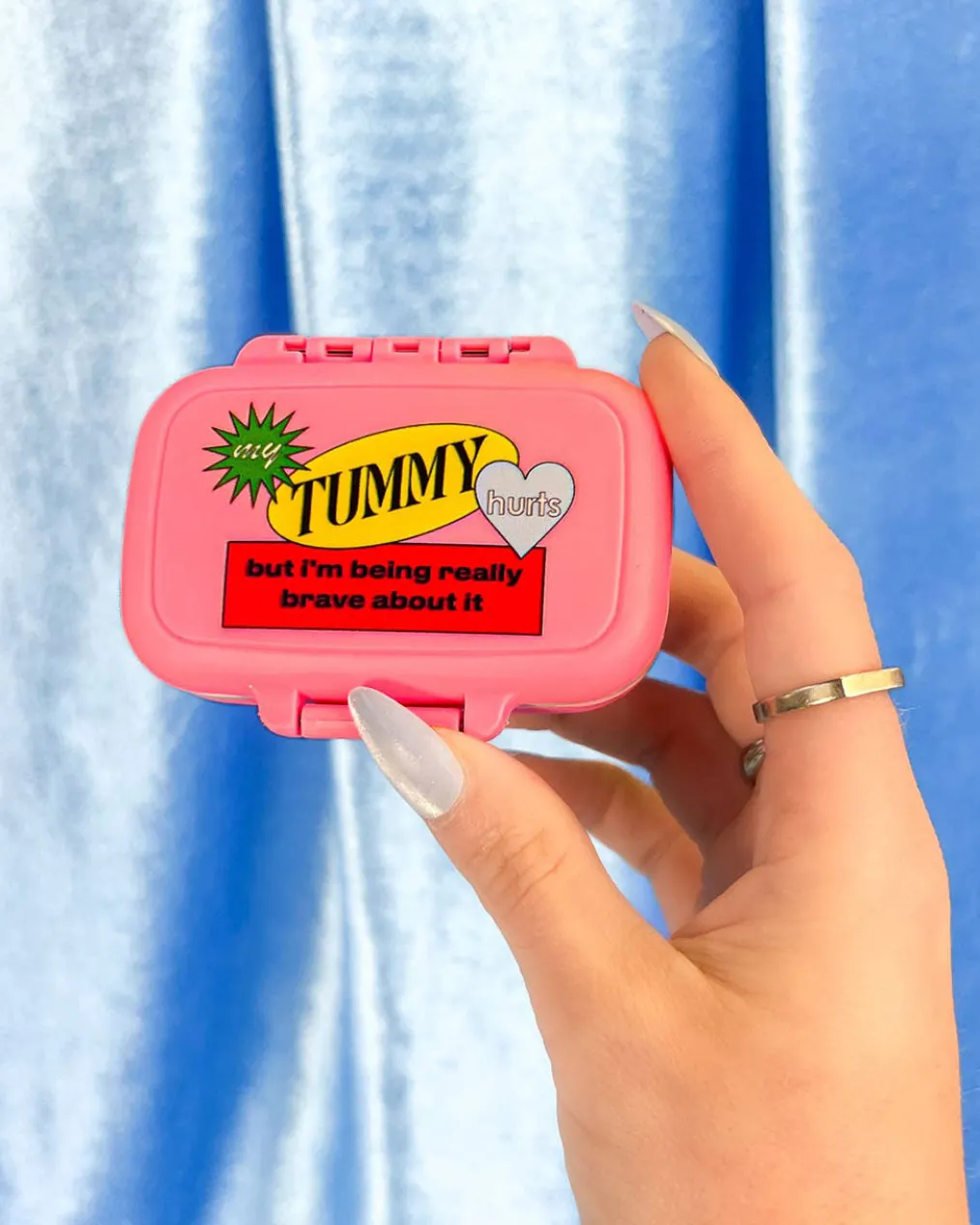 My tummy hurts, but I’m being really brave about it! This popular design now comes in a pill container. Carry your meds and vitamins in style with this pink pill case that has two convenient, removable dividers on the inside that creates 3 separate compartments . Shaped like an adorable mini suitcase. Waterproof + smell proof!