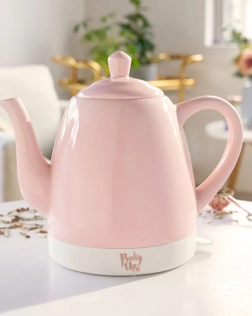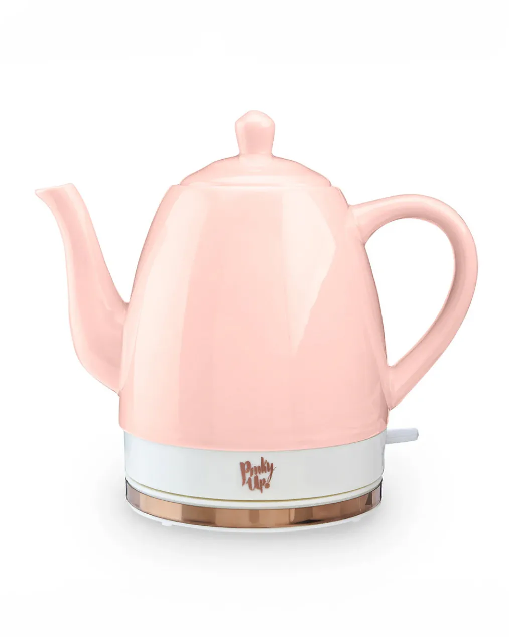 Fashion meets function with this stylish tea kettle. The Noelle Ceramic Electric Tea Kettle features glossymintceramic glazing and a trendy rose gold metallic base. Includes a plug-in base, 1.5 L capacity, and an easy on/off switch.