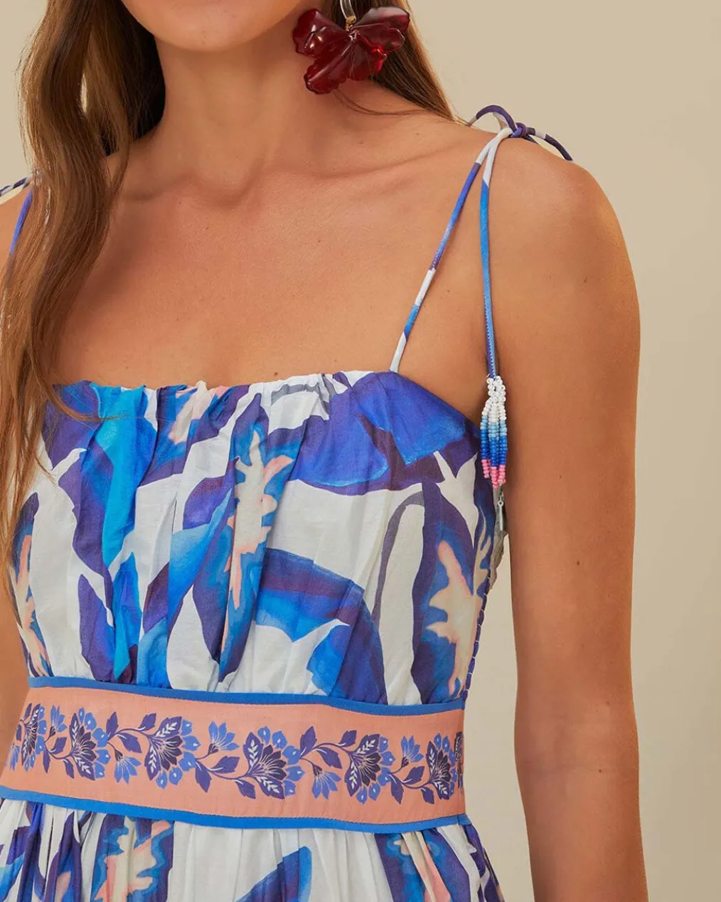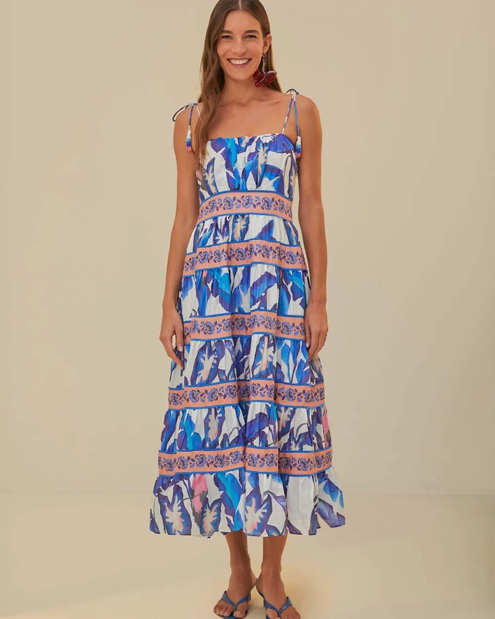 Embrace the rhythm of nature with the Off-White Blue Foliage Midi Dress, enchantingly tailored with a square neckline. Its tapestry of blue foliage dances across an off-white hue with layers creating a fluid silhouette. Delicate tiered ruffles cascade down, while the playful straps, finished with tassels, add a touch of whimsy. Find your own story woven into the soft, ethereal fabric of this captivating piece.