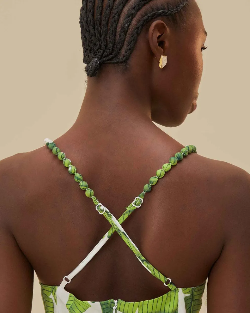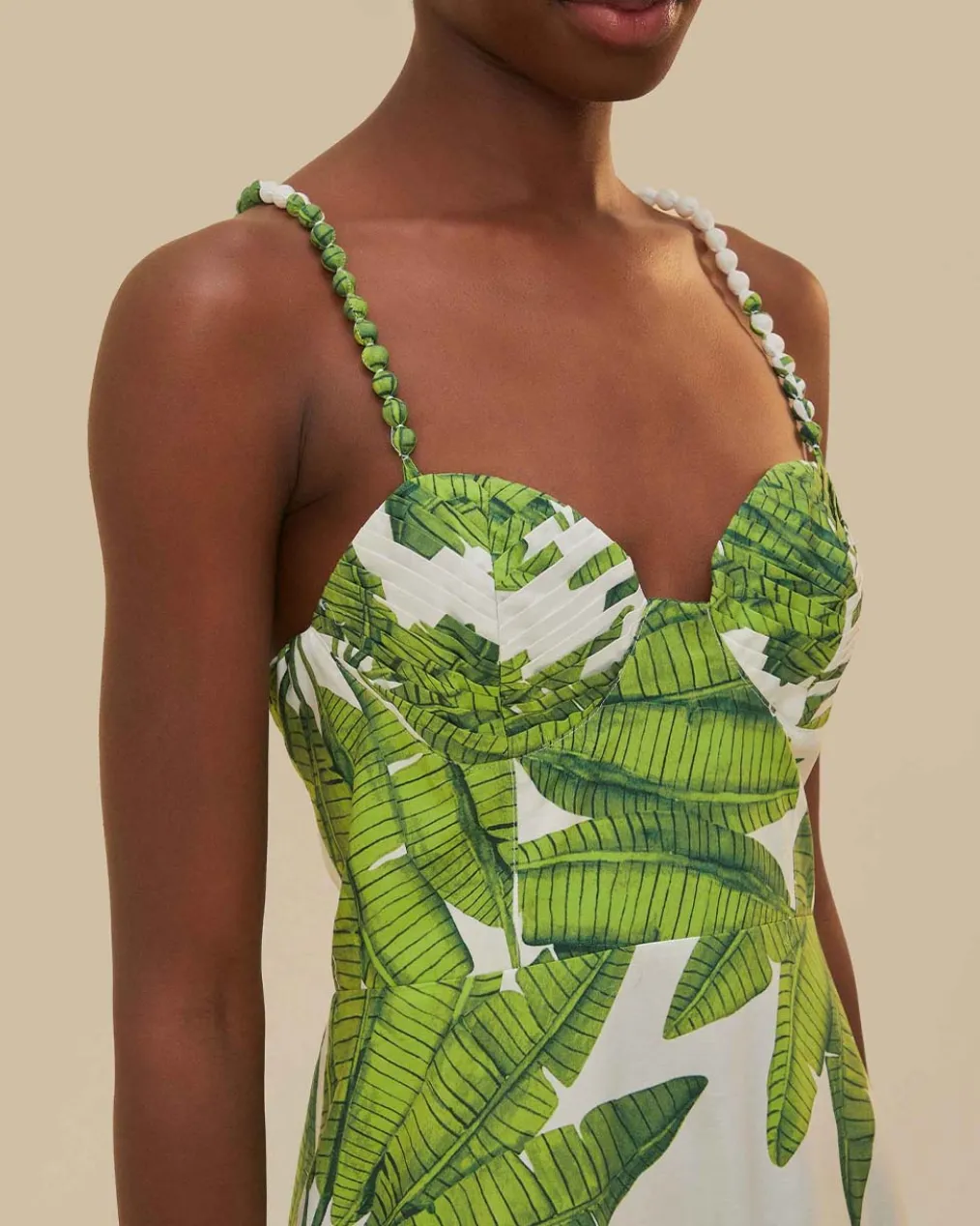 Breathe in the tropical allure of the Palm Fan Off-White Midi Dress, adorned with a refreshing green palm leaf print. This enchanting piece features a flattering sweetheart neckline and playful braided straps, creating a harmonious symphony of natural elegance and graceful femininity. The tiered skirt dances around the mid-calf, promising to whisk you away on an endless summer adventure with every swish. Indulge in the beauty of nature elegantly draped in this exquisite FARM Rio creation.