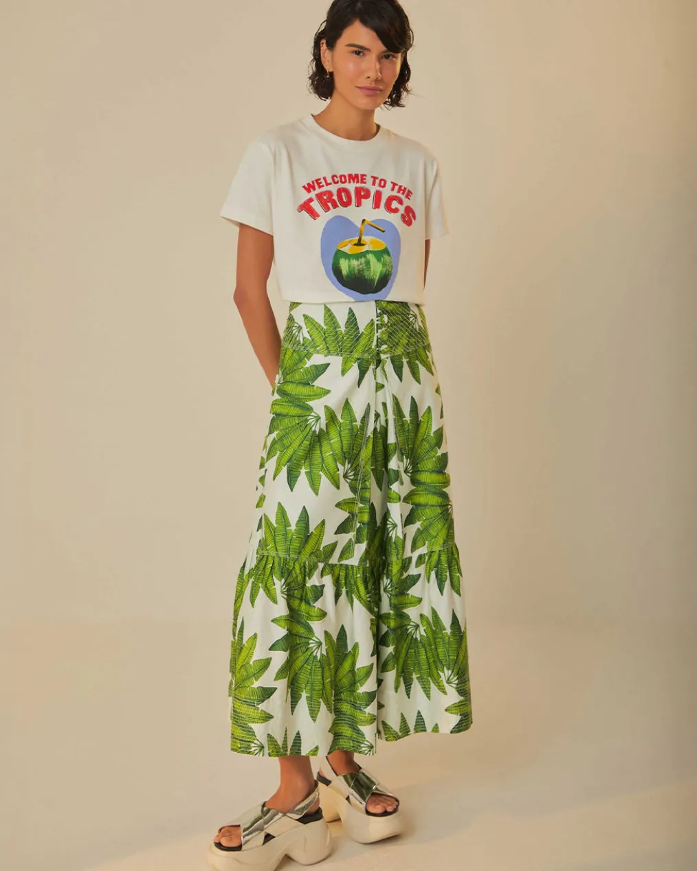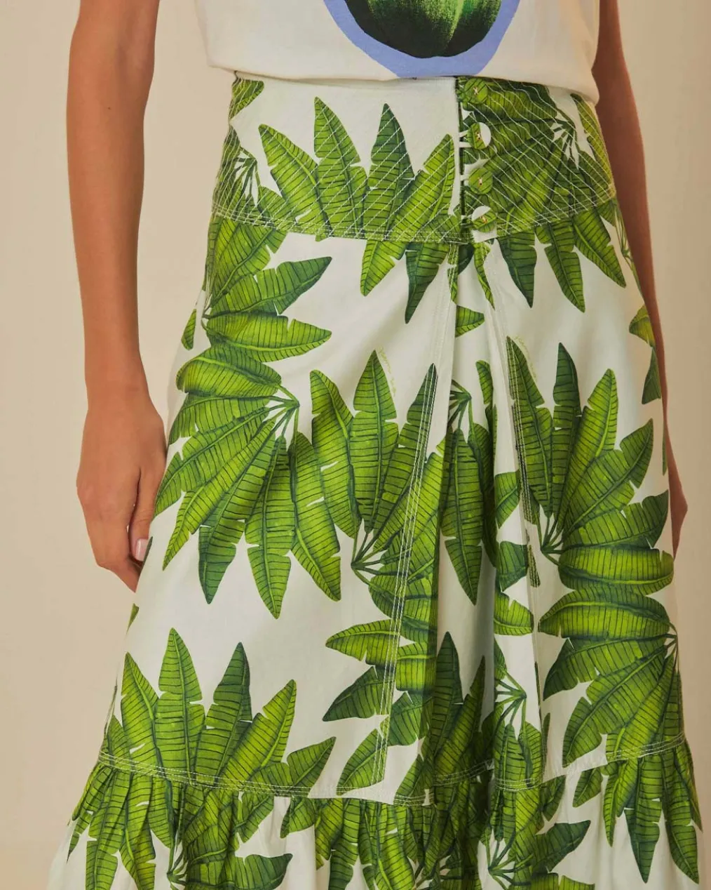 Embrace the tropical vibe with the Off-White Palm Fan Organic Cotton Maxi Skirt, a playful yet elegant piece perfect for sunny escapades. Crafted from organic cotton, this skirt flourishes with a vibrant green palm fan print set against a serene off-white backdrop. The flattering high-waist cut and gentle flow of the fabric create a beautiful silhouette, ensuring a comfortable fit while you make a breezy statement. This eye-catching design promises to be the center of attention at any gathering or day out. 100% Certified Organic Cotton: GOTS-certified organic cotton has a lower environmental impact than conventional cotton, as it reduces water usage, greenhouse gas emissions, and the amount of chemicals used.