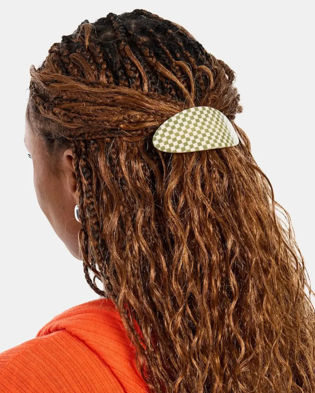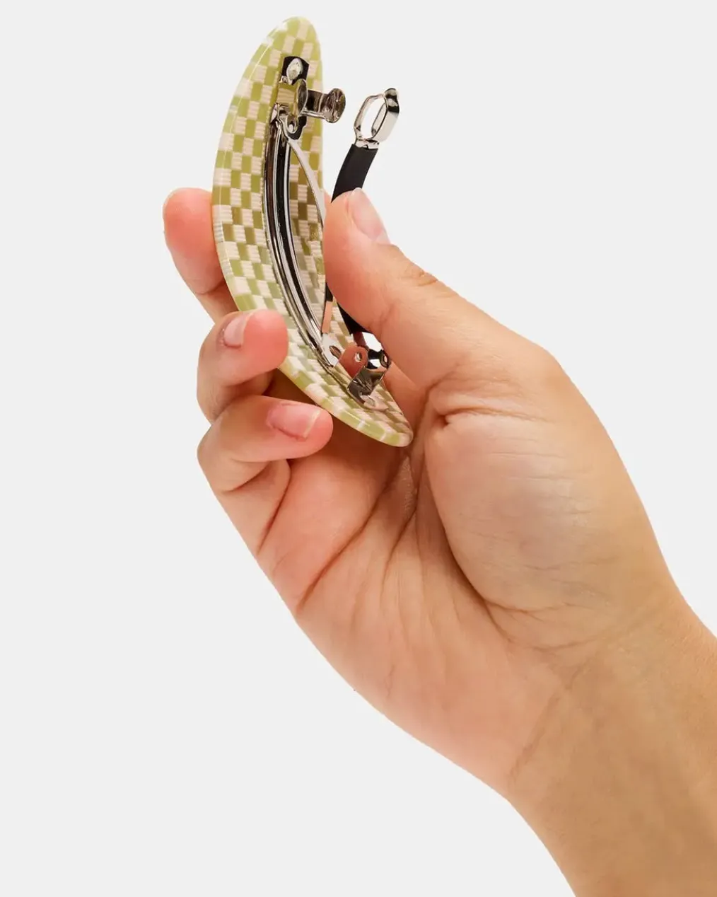 A classic oval shaped barrette in a bold stripe pattern. The curved french clip style is perfect for half holds on all types of hair.