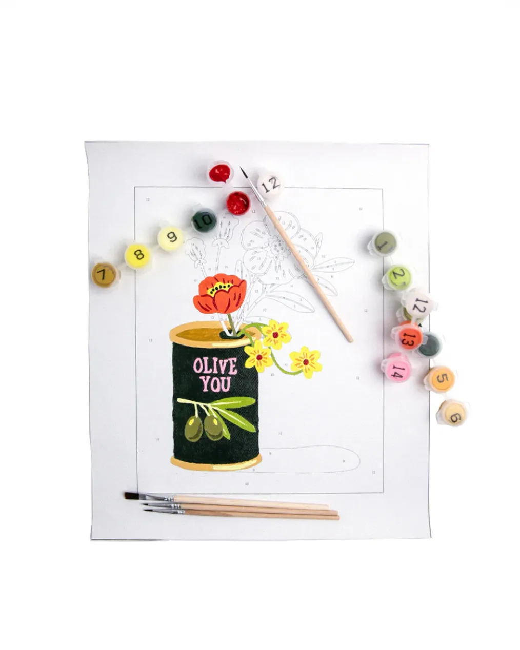 Olive You is the punniest little paint by numbers kit your heart (and your wall) could ask for. This 8×10 canvas features a vintage-style olive can turned vase, brimming with cheerful blooms and topped with a sweet message of affection. It’s the perfect blend of quirky, cute, and crafty.