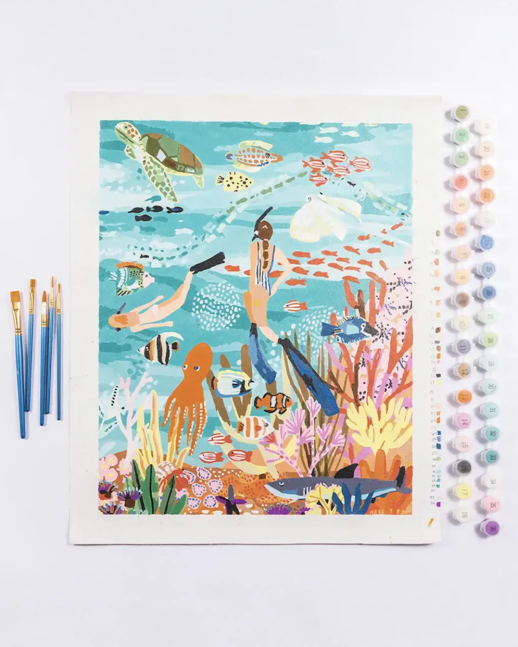- Includes: 16 in. x 20 in. ready-to-paint premium printed canvas, a 5 brush set, and 36 handy little pots of acrylic paint