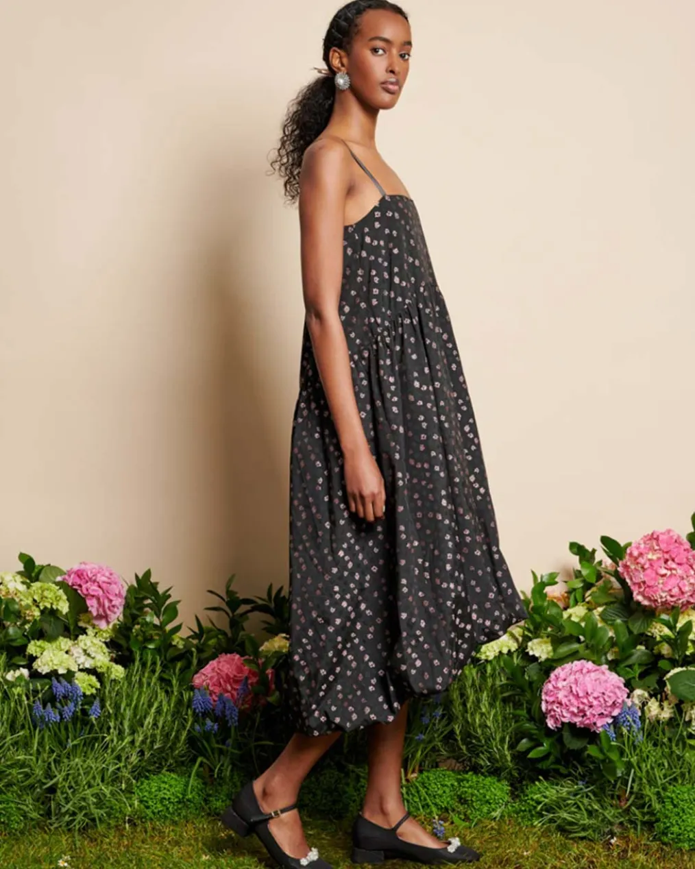 - A loose-fit midi dress in a ditsy floral jacquard fabric.