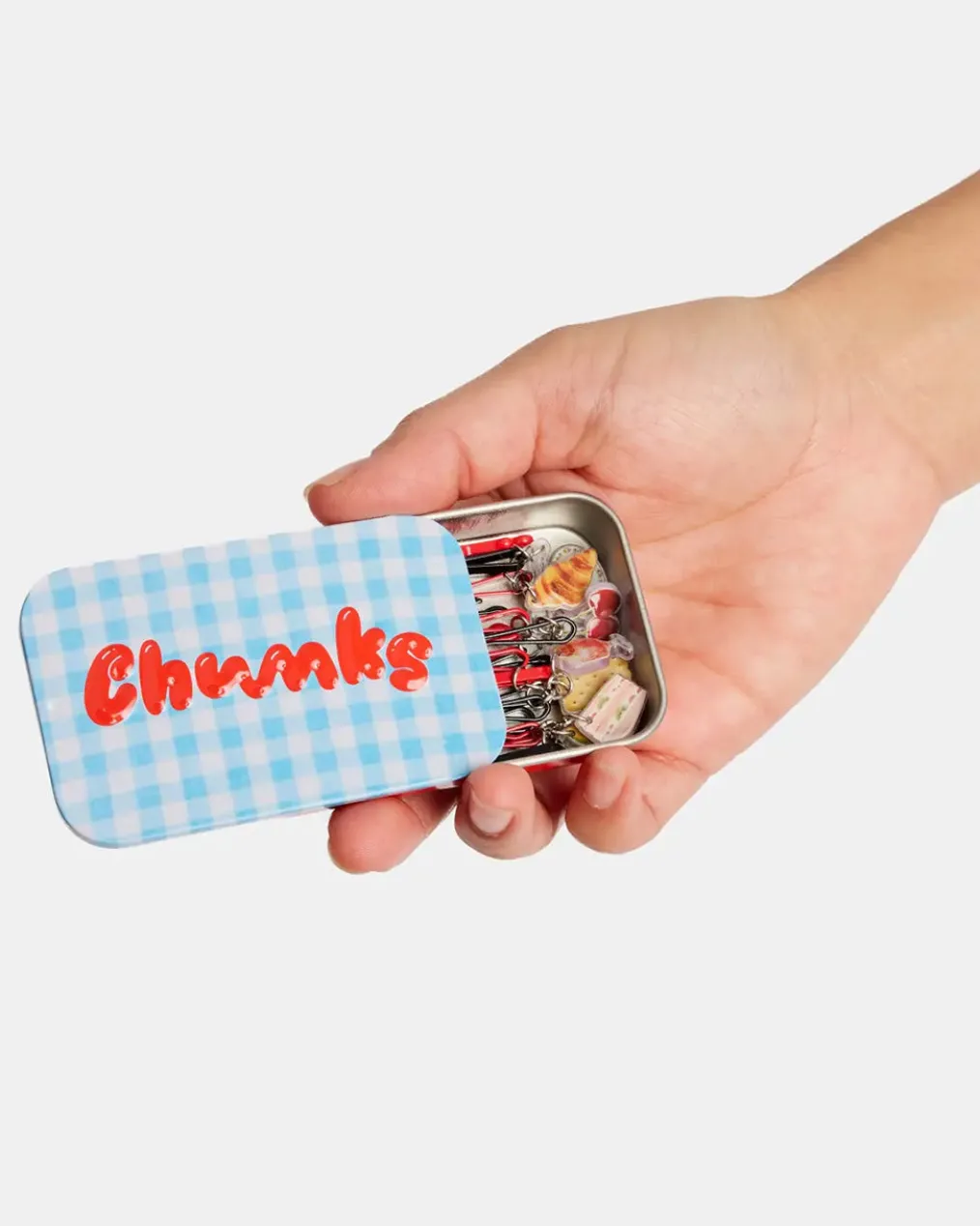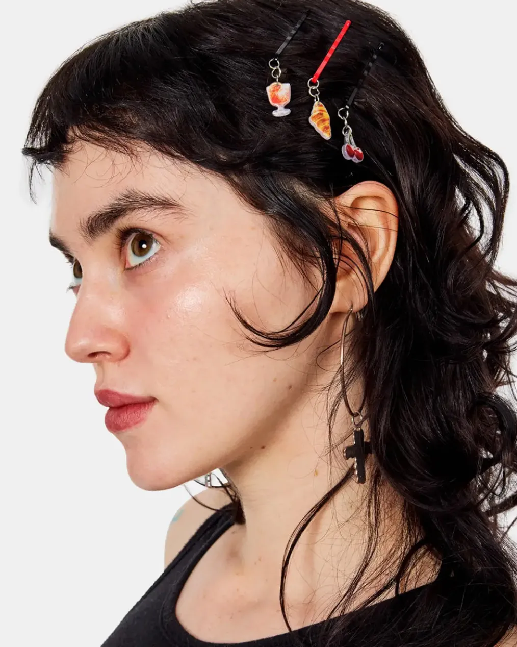 A set of 20 black and red, enamel-coated bobby pins and 8 picnic-themed acetate charms. Comes in a colorful, reusable metal tin.