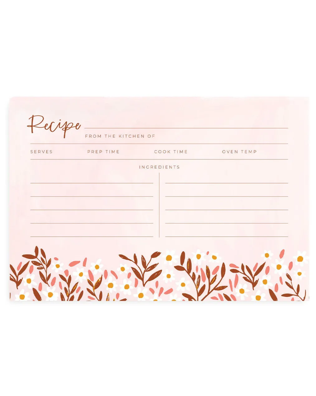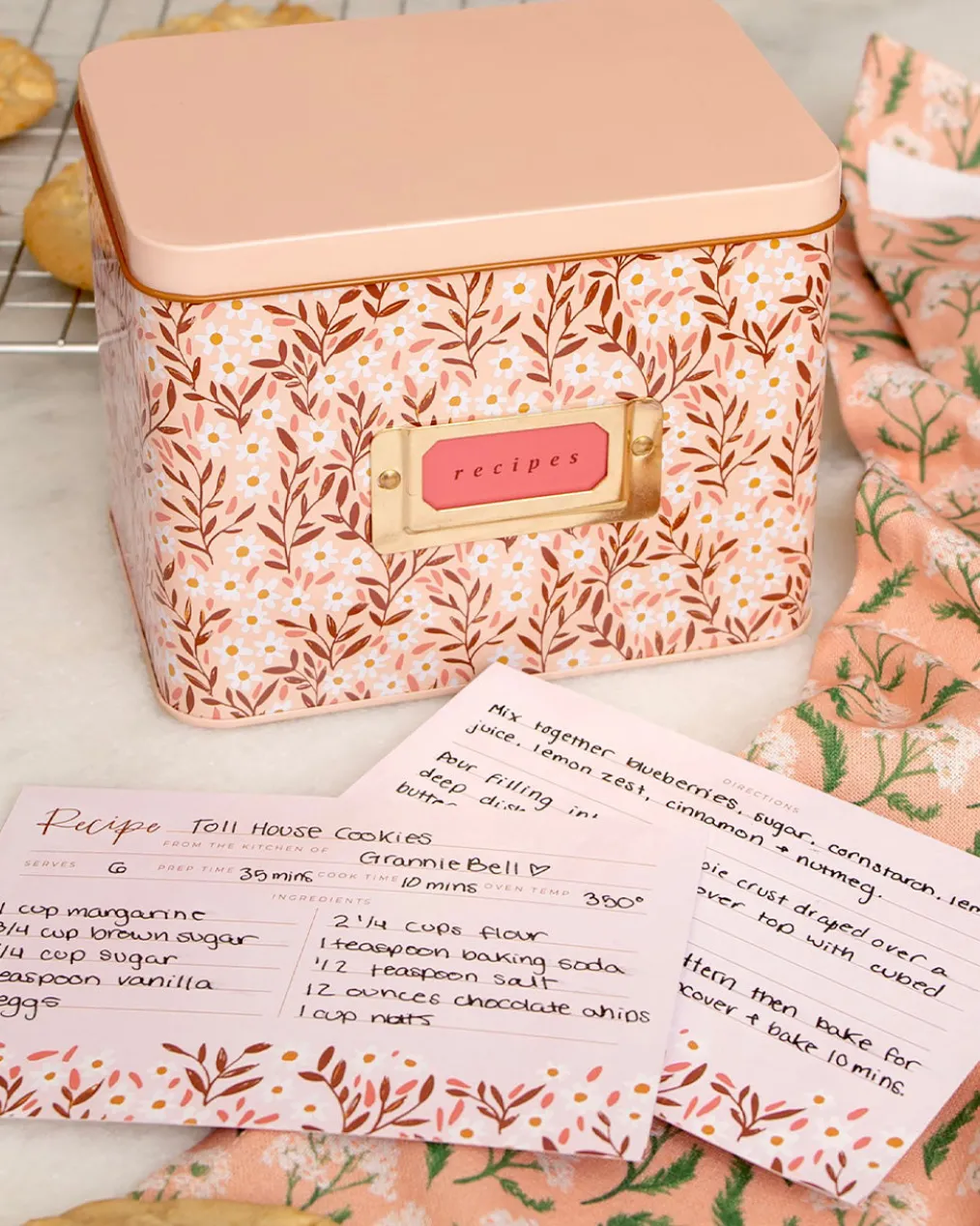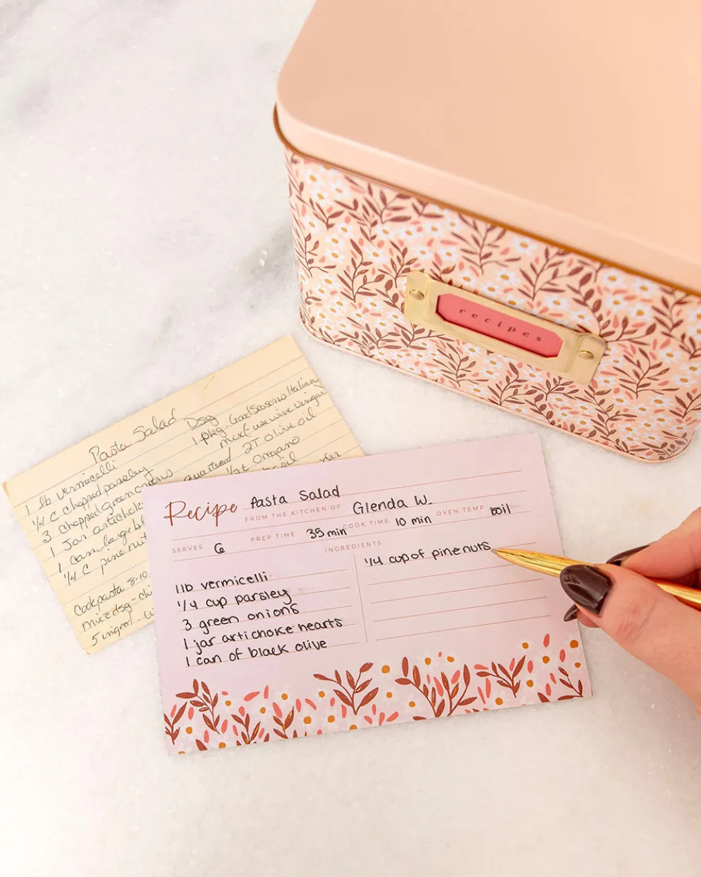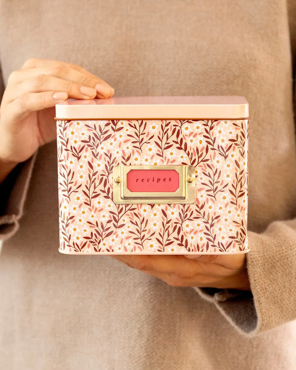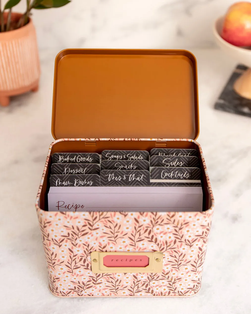 - Features: Hinged lid, metal bookplate on front, includes 15 Pink Daisy Recipe Cards and 1 pack of Dark Herringbone Recipe Divider Tabs