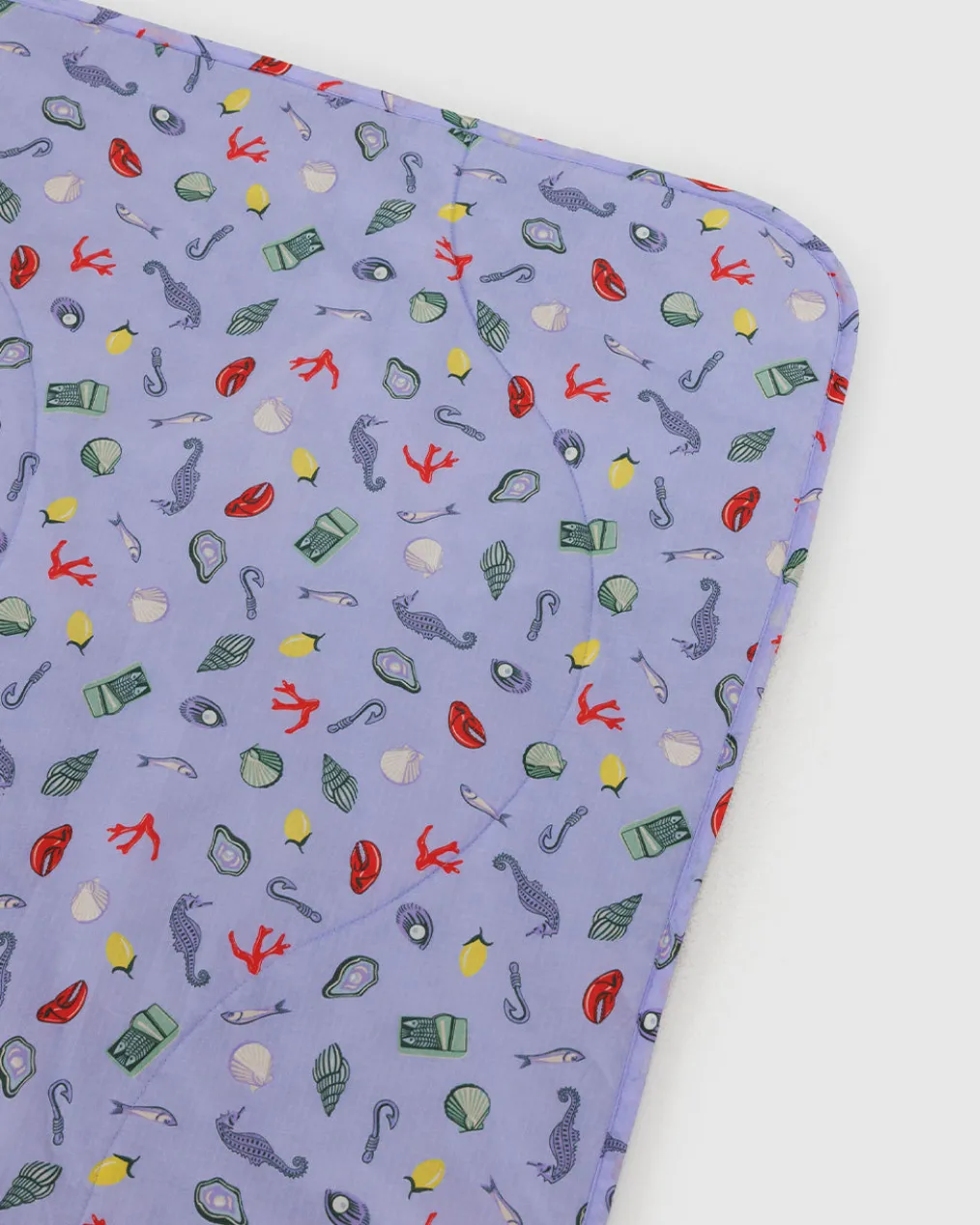 A quilted nylon picnic blanket with a velcroclosure so you can roll it up and bring it anywhere.