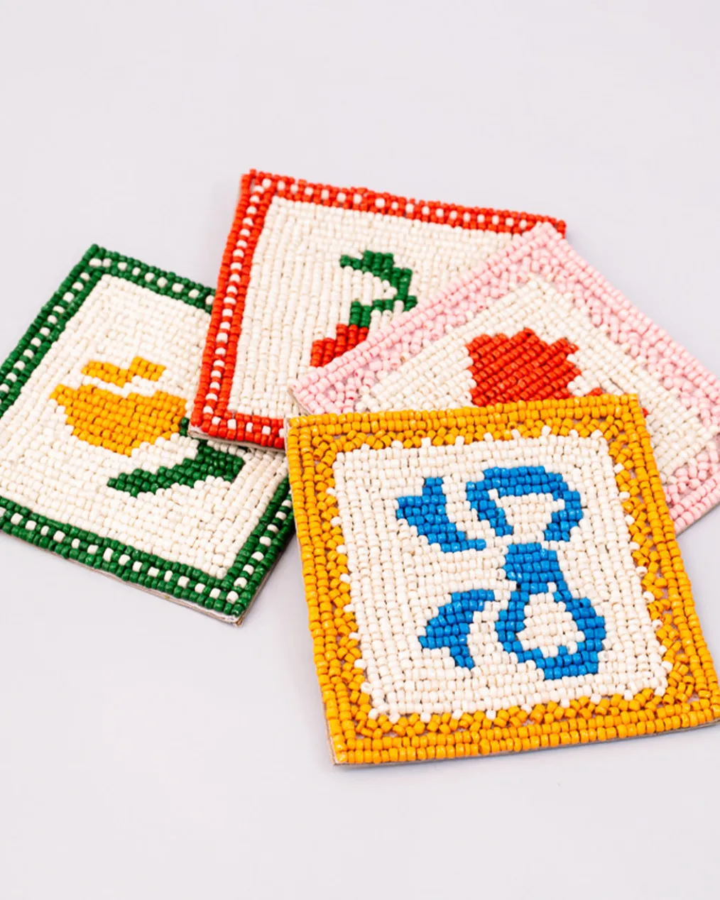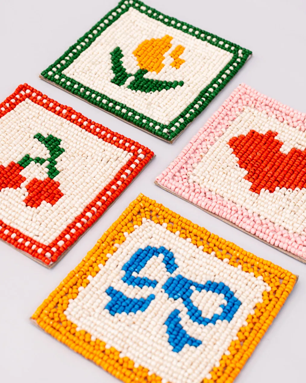 Pretty sure we made the cutest coasters ever. This set of four is made with seed beads and features a unique design on each one.