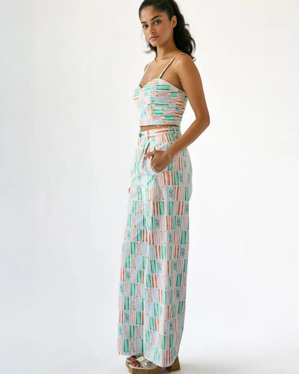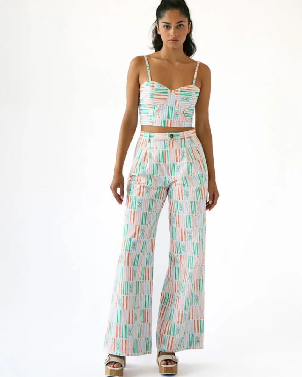 Dress like a seagull’s POV, in Rose! On Rachel Antonoff’s newest spring pant, birds-eye beach chairs bask on a plain of 100% cotton twill. While sadly bereft of delicious trash, Rose offers a wide-leg, high-waisted silhouette and flattering little front pleats. Toss on over a bikini for an instant put-together beach look, or go full gull by pairing with the Keller top and stealing your date’s fries.